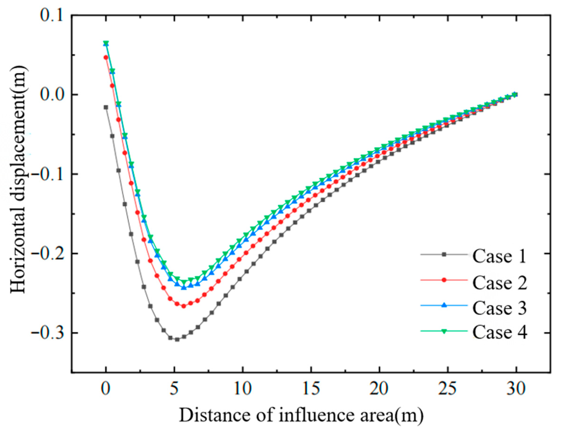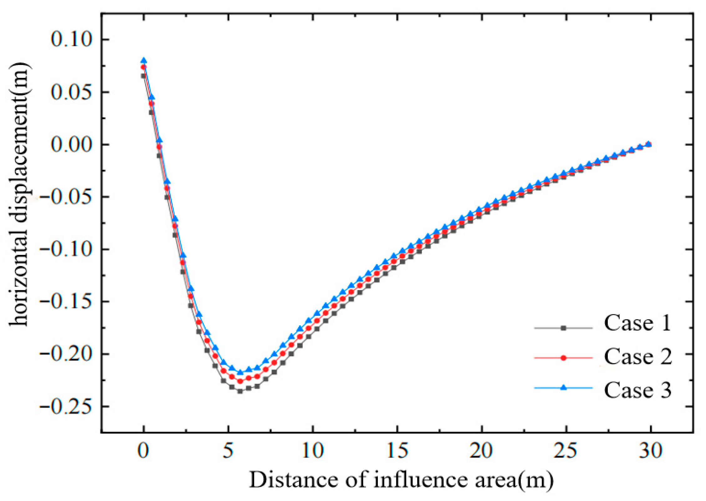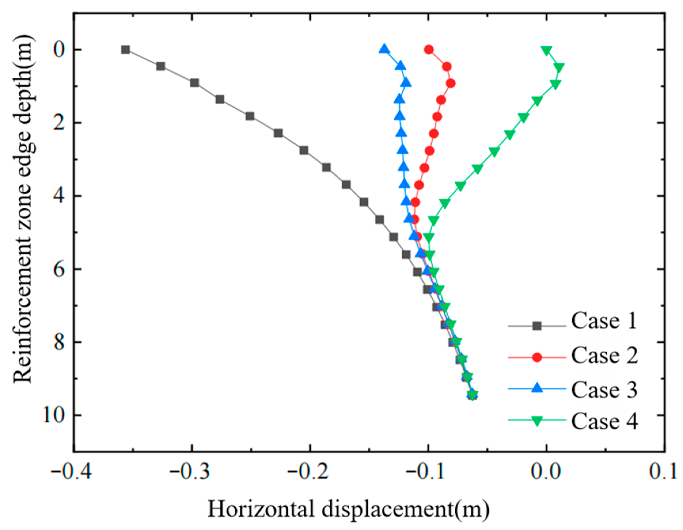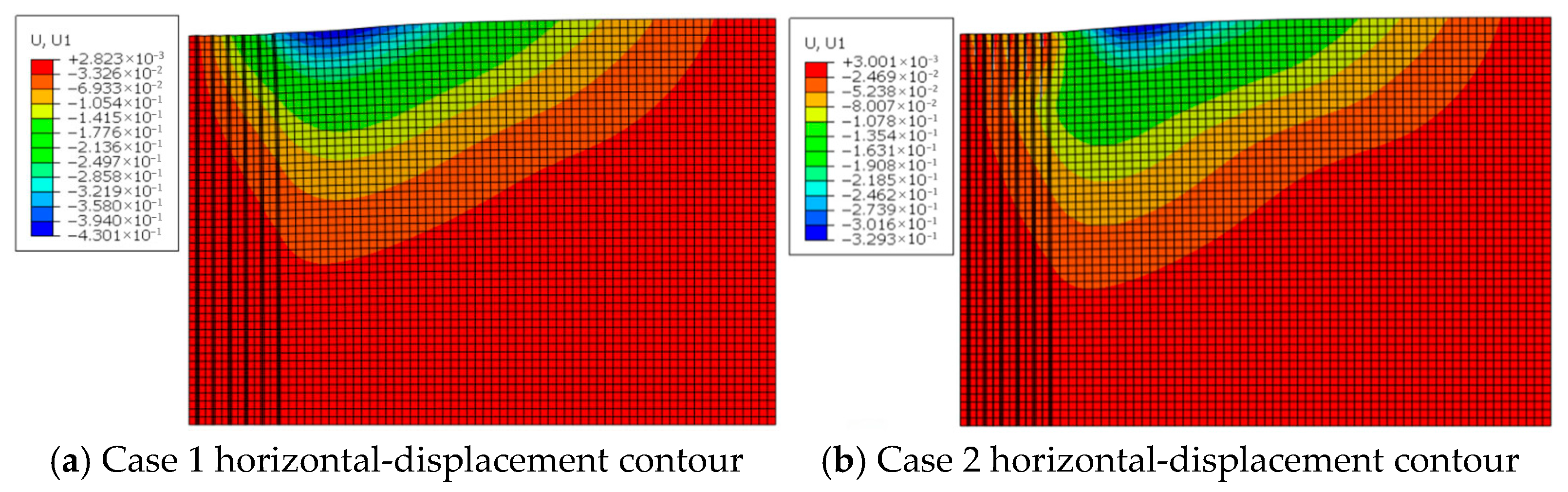 - The final magnitude of horizontal displacement is closely related to the timing of air-bag pressurization; the earlier the pressure is applied—when the soil’s effective stress is still low—the more pronounced the improvement in horizontal displacement becomes.