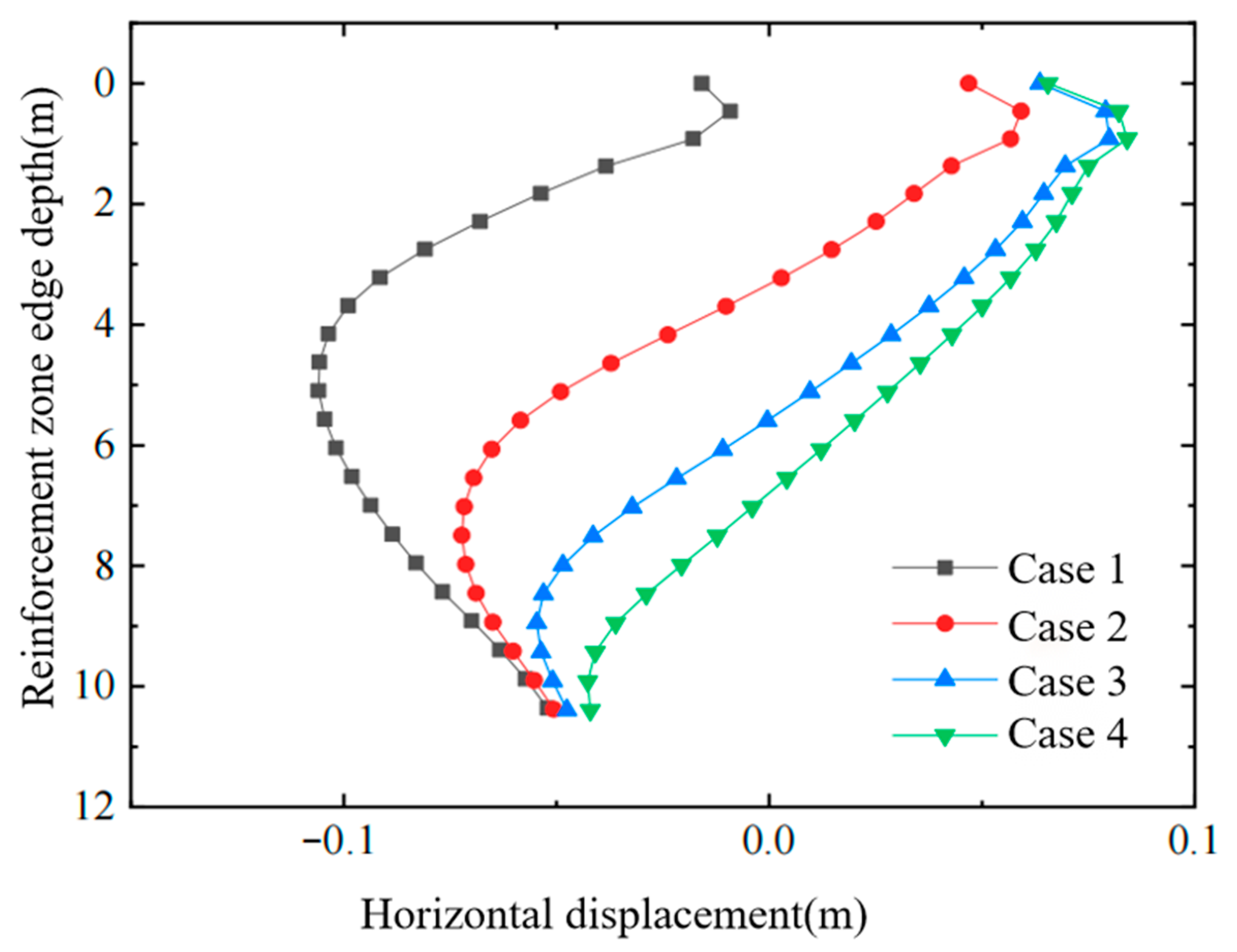 - Compared with applying a uniform air-bag pressure over the entire depth, the stepped “smaller-at-top, larger-at-bottom” pressure distribution more effectively counteracts the inward vacuum-induced contraction, reducing the horizontal displacement of the deep soil and, in turn, further decreasing the negative horizontal displacement of the upper layers.