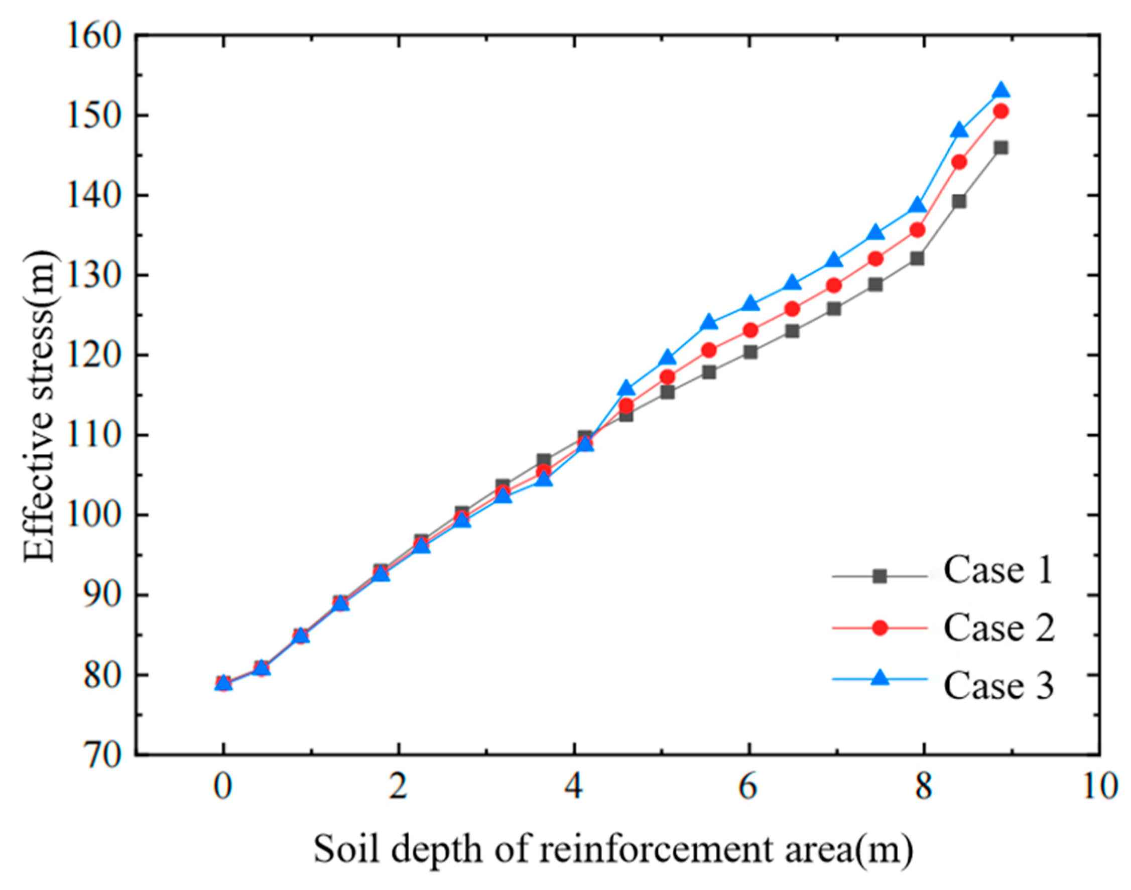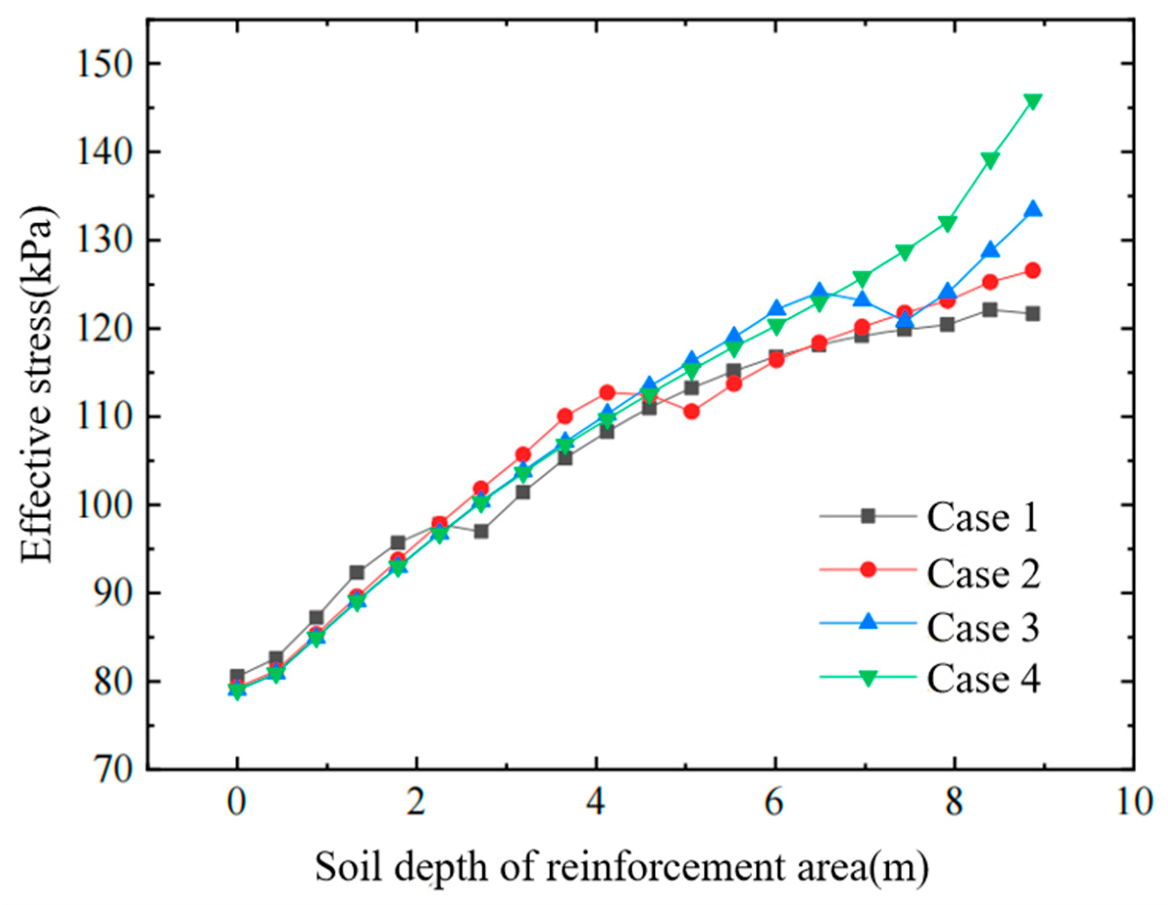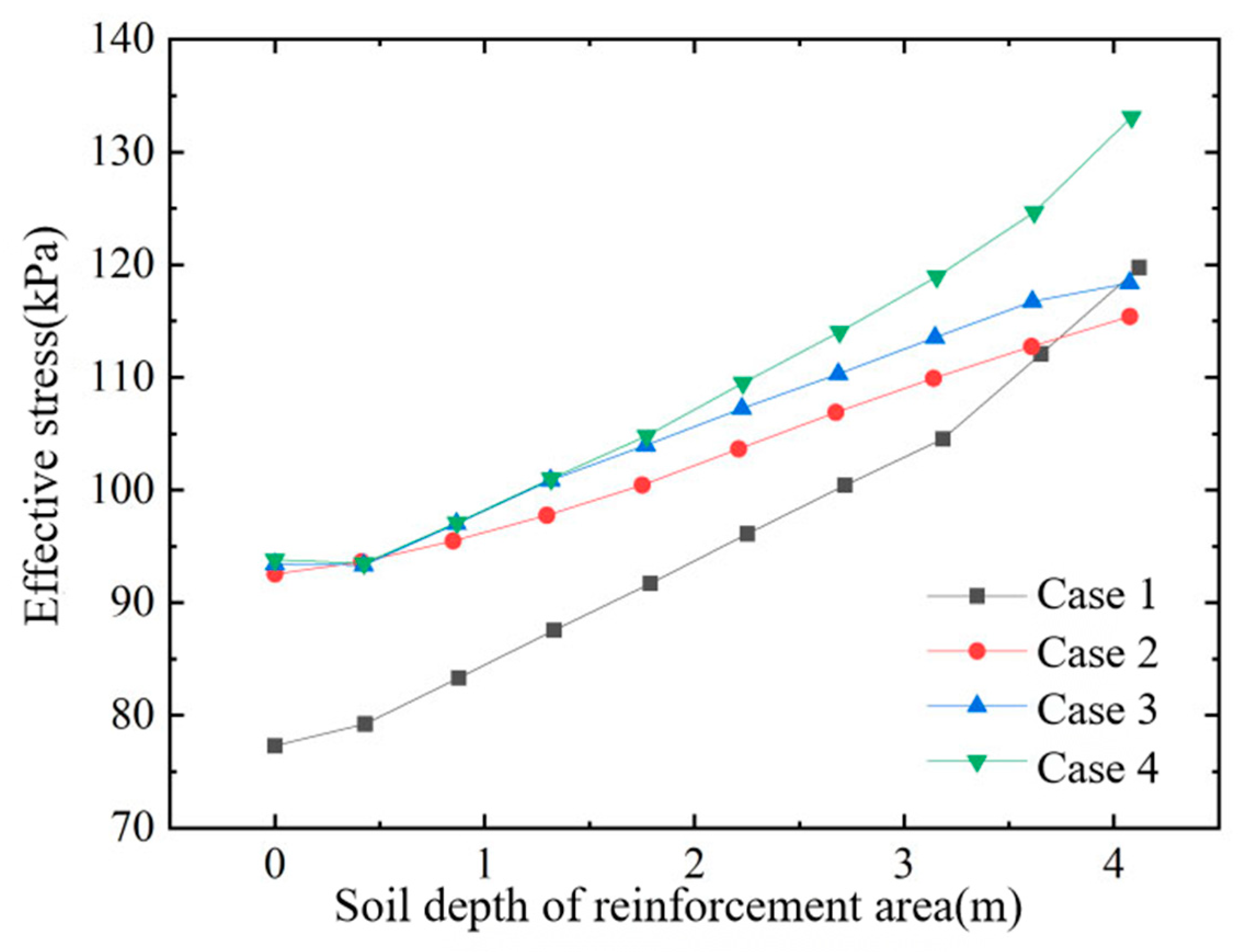 - For the same surcharge pressure and soil depth, the effective stress in the soil increases significantly after air-bag pressurization, and this effective stress rises with the magnitude of the air-bag pressure.