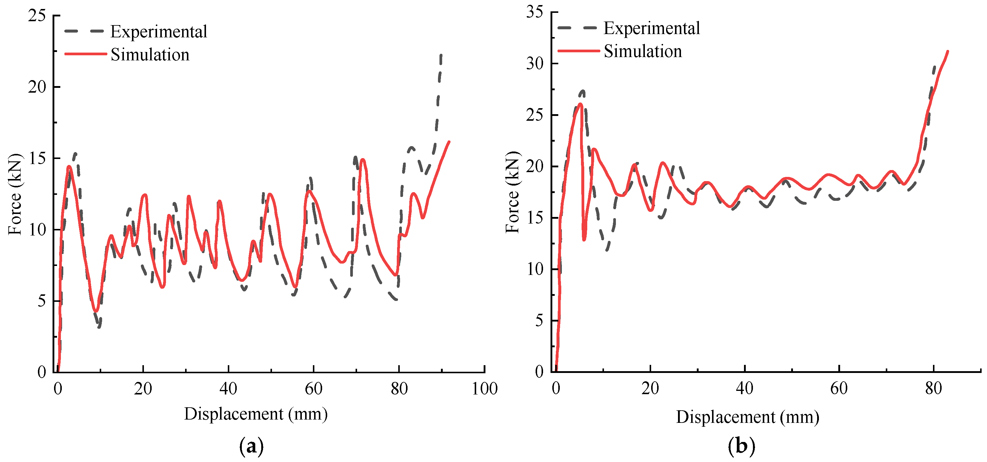 Under the same axial impact load, the load–displacement curve of the bio-inspired tube shows a significantly different trend compared to the thin-walled tube. First, the impact force of the bio-inspired tube fluctuates only during the initial impact, while the impact force of the thin-walled tube fluctuates significantly throughout the entire impact process. This corresponds with the progressive folding deformation mode shown in