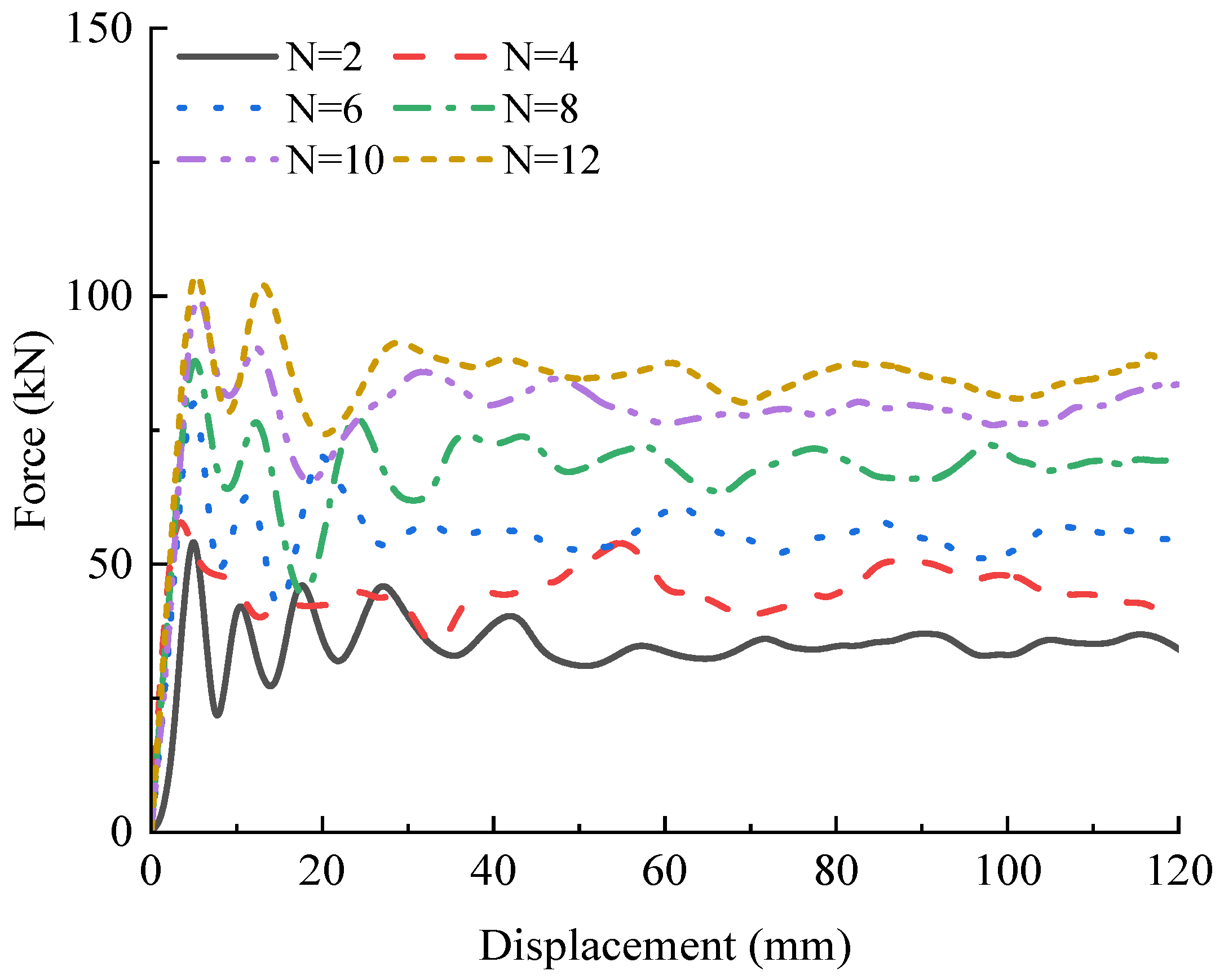 In contrast, BCSTs with a higher cell count (e.g., N = 12) demonstrate a more stable and efficient crushing process. After the initial peak, the impact force maintains a high and stable plateau value, indicative of sustained energy dissipation through the coordinated collapse of multiple cells. Furthermore, both the initial peak force and the plateau force level exhibit a gradual increase with the cell number, underscoring that additional cells provide enhanced structural support and more distributed energy-absorbing units.