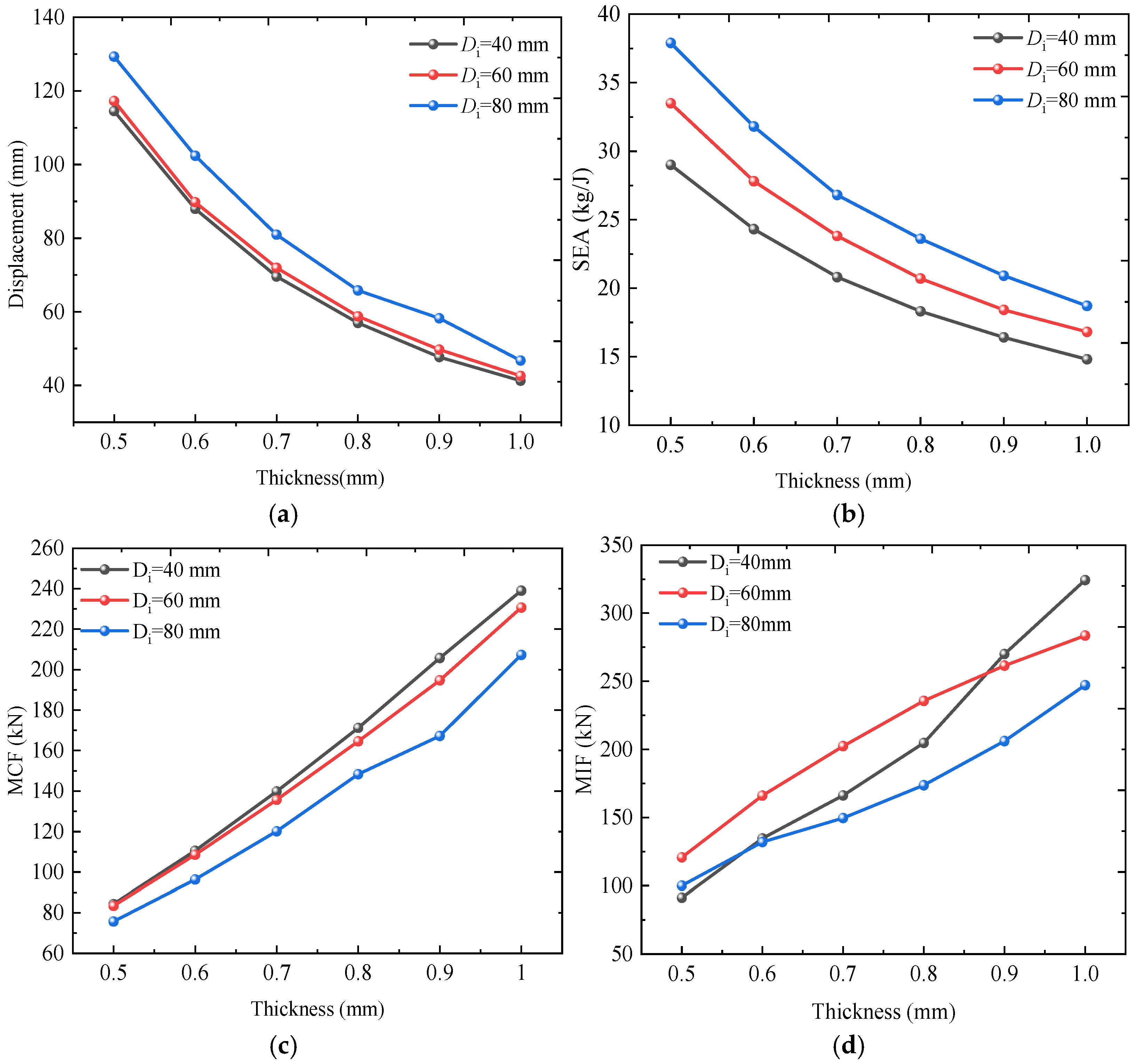 Di = 80 mm, the MIF increases by 174% from 75.6 kN to 207.3 kN over the same thickness range. Detailed data are provided in