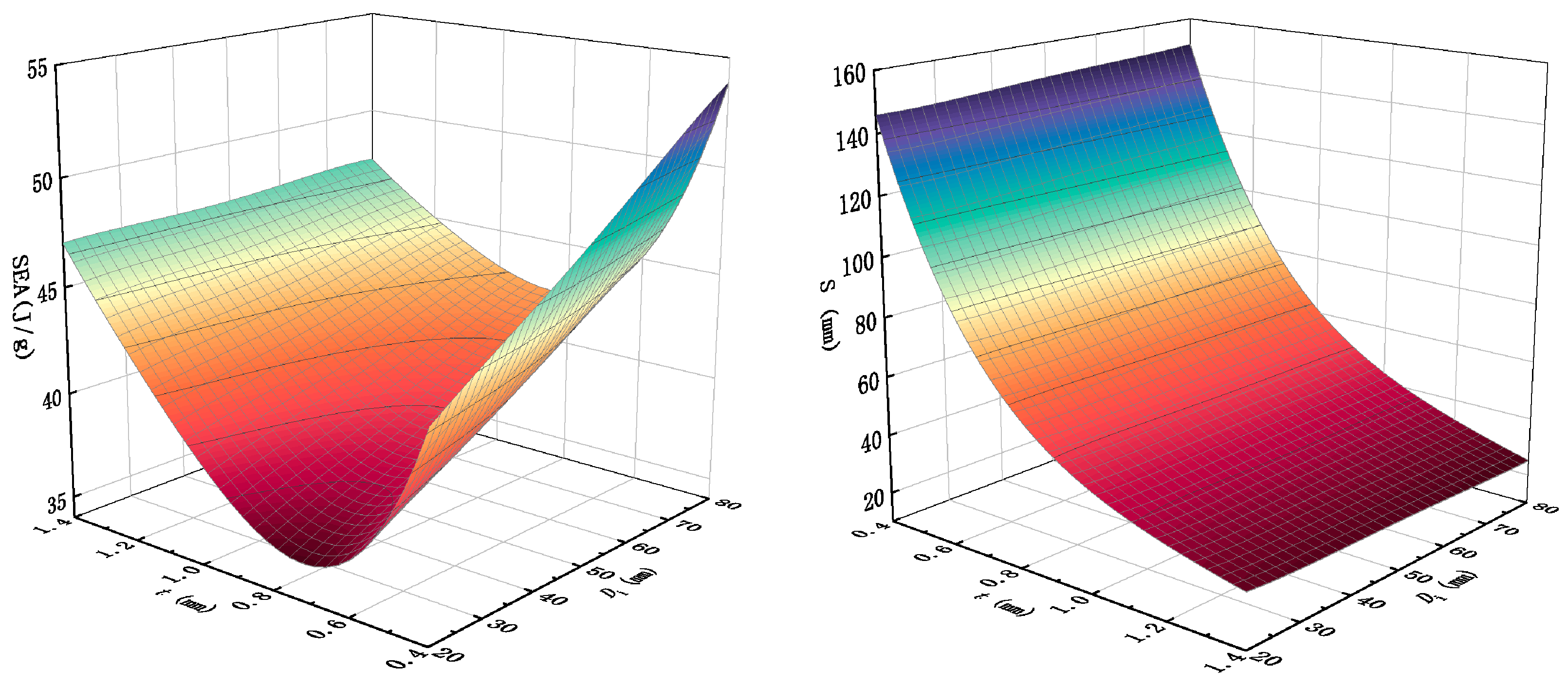 The t and Di are two critical yet distinct design parameters. Increasing the wall thickness primarily enhances structural stiffness and force levels (i.e., MCF and MIF) but at the cost of reduced crushing displacement and lower mass efficiency (i.e., SEA). Conversely, increasing the inner diameter improves SEA by lightweighting the structure, albeit with an increase in crushing displacement. Therefore, achieving an optimal crashworthiness design requires a balanced consideration of the synergistic effects between wall thickness and internal diameter.
