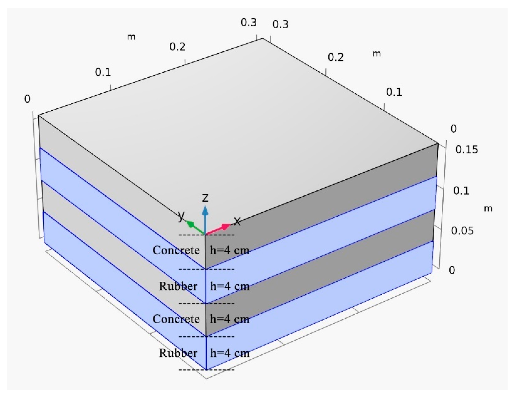 - One-dimensional periodic foundation: A one-dimensional (1D) metamaterial structure composed of alternating rubber and reinforced concrete blocks. This configuration was designed to attenuate vibration energy in the z-direction through frequency band gaps. Compared with the conventional foundation, the 1D periodic structure distributes vibration energy across target frequencies based on metamaterial principles.