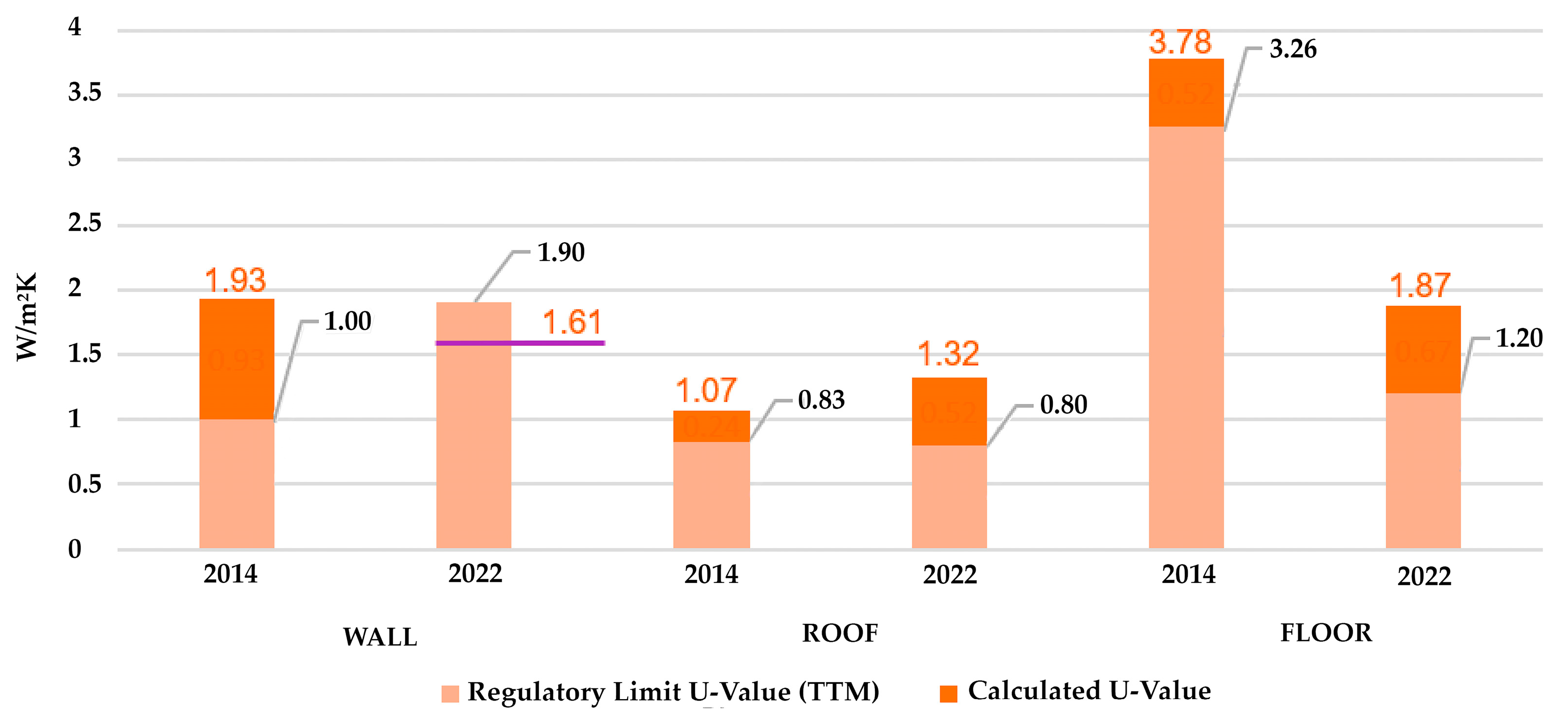 - Systemic Non-Compliance: The building envelope exceeds U-value limits of EM.110 (2014 and 2022 draft), with the roof exhibiting the highest thermal transmittance.
