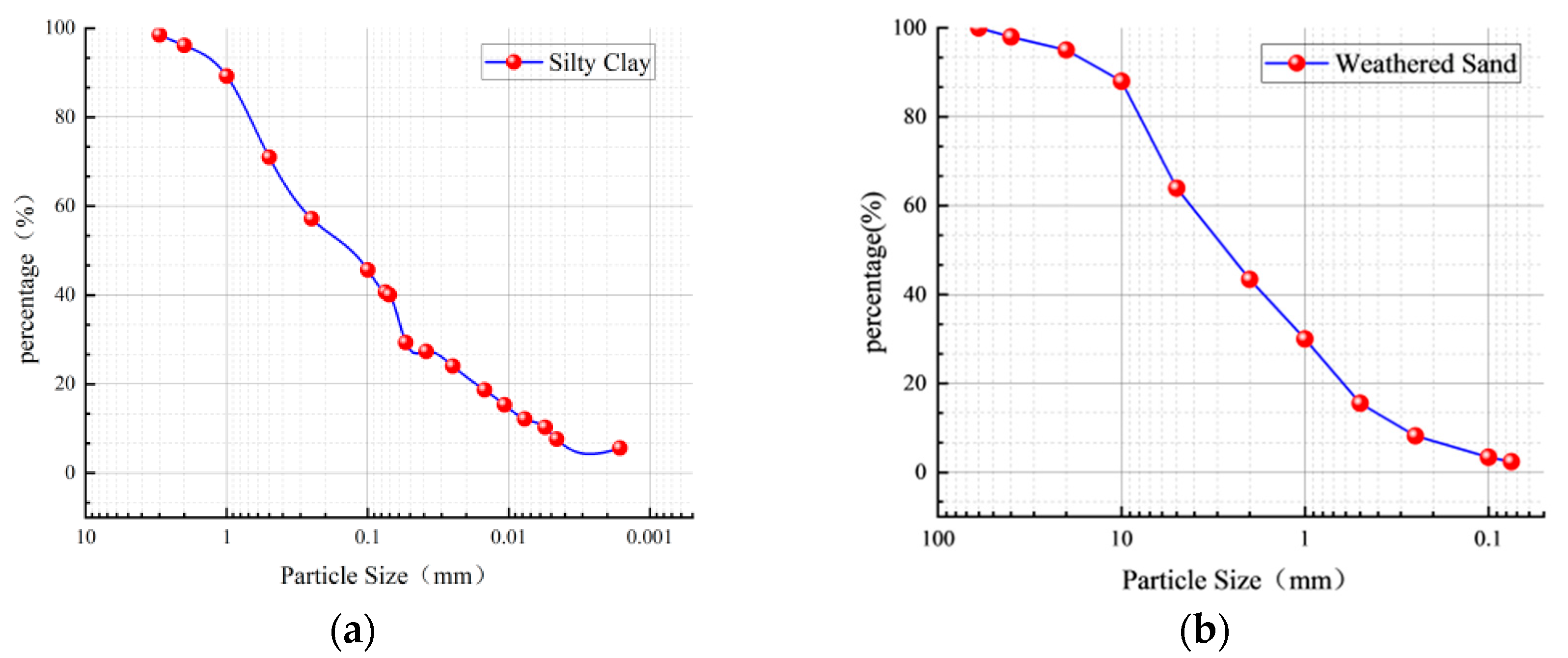 22]. The widespread distribution of silty clay and weathered sand in Northeast China presents two typical backfill materials with contrasting engineering properties—the former being primarily cohesion-dependent and the latter dominated by frictional characteristics [