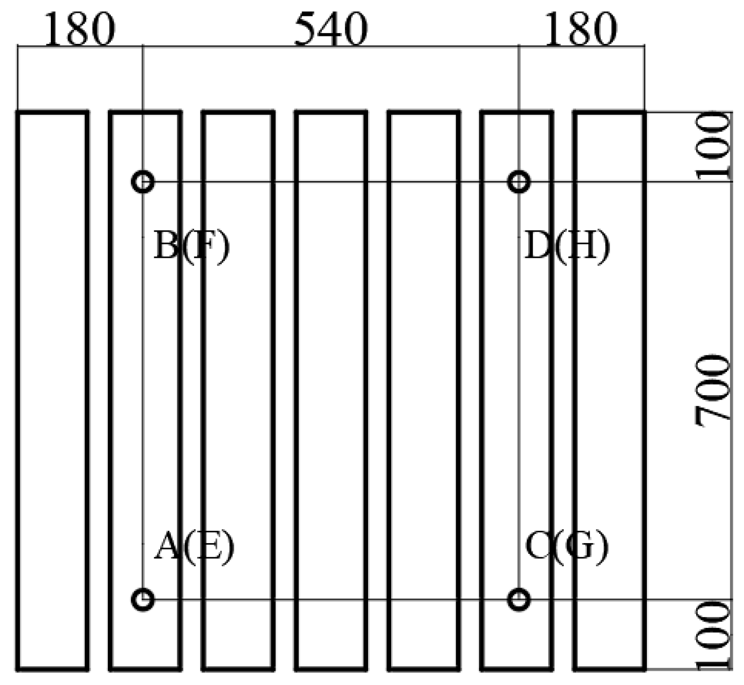 Figure 14 presents the stress variation curves at different measurement points on the fourth-layer I-beams during the loading process. The stress at all measurement points increased either nearly linearly or with accelerated growth with the applied load, demonstrating a stable positive correlation between the structural response and loading. The stress at each measurement point progressively increased with the applied load. Under uplift loading, the fourth-layer I-beams, arranged in a seven-beam configuration, remained entirely in a state of linear elastic tension. These beams primarily resisted the backfill soil pressure during loading, with the maximum recorded stress reaching 250 MPa, representing the highest stress level observed in the test program.
