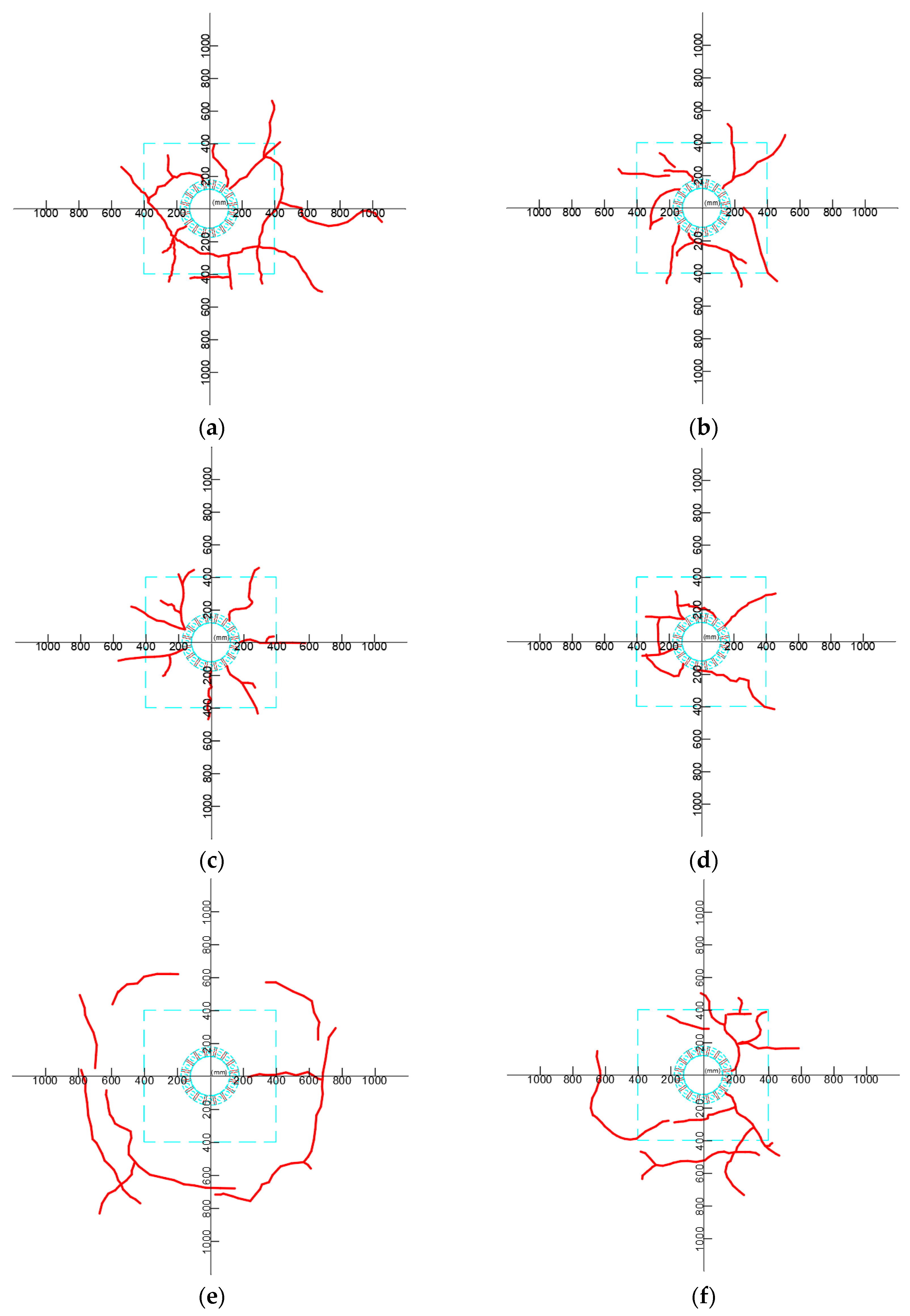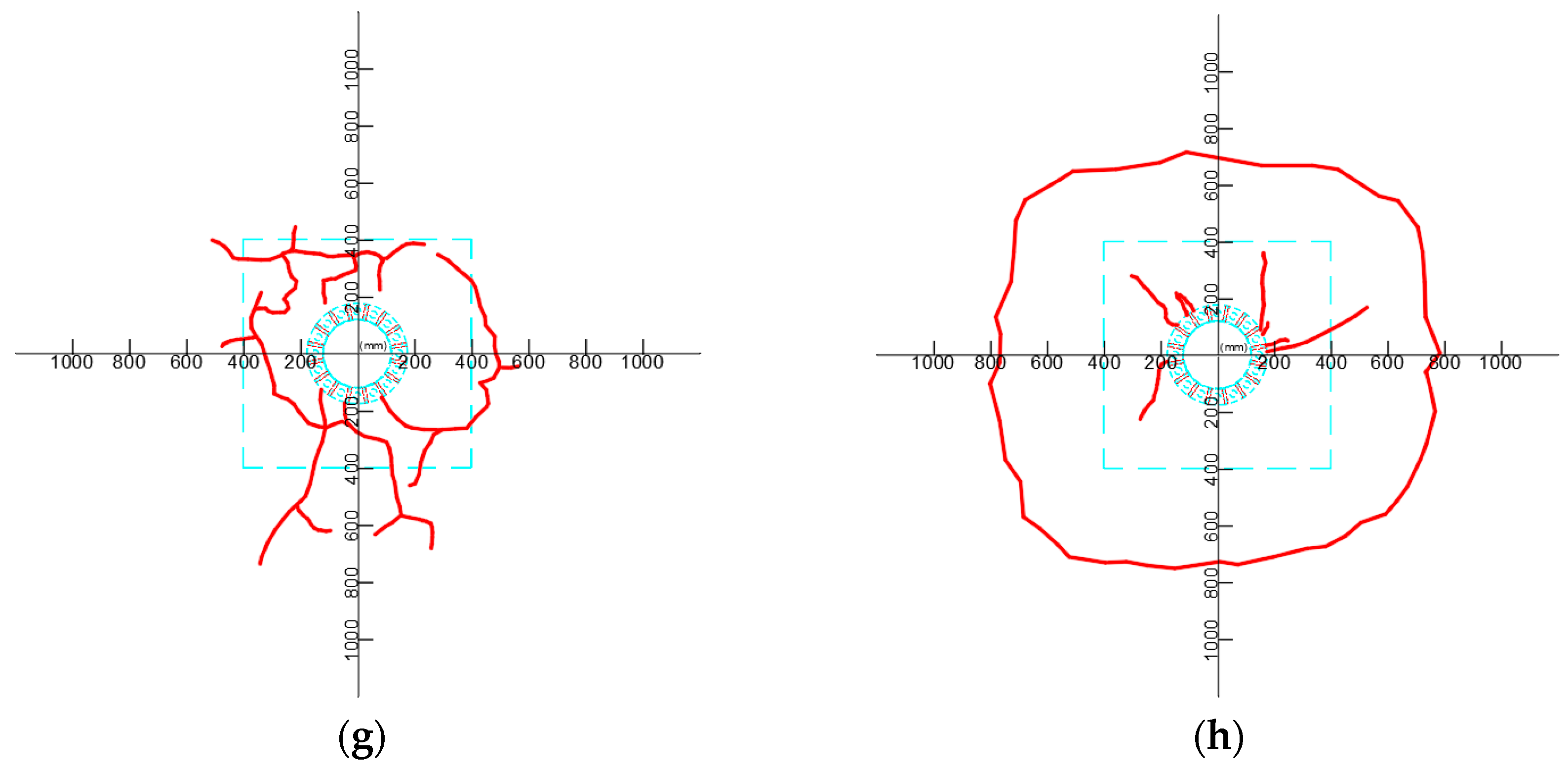 Figure 6 illustrates the crack patterns developed in the soil surrounding the foundation. In the figure, the blue lines represent the outline of the test foundation, while the red lines indicate the soil cracks. During the initial and intermediate stages of loading under all test conditions, radial cracks emanating from the foundation center were observed.