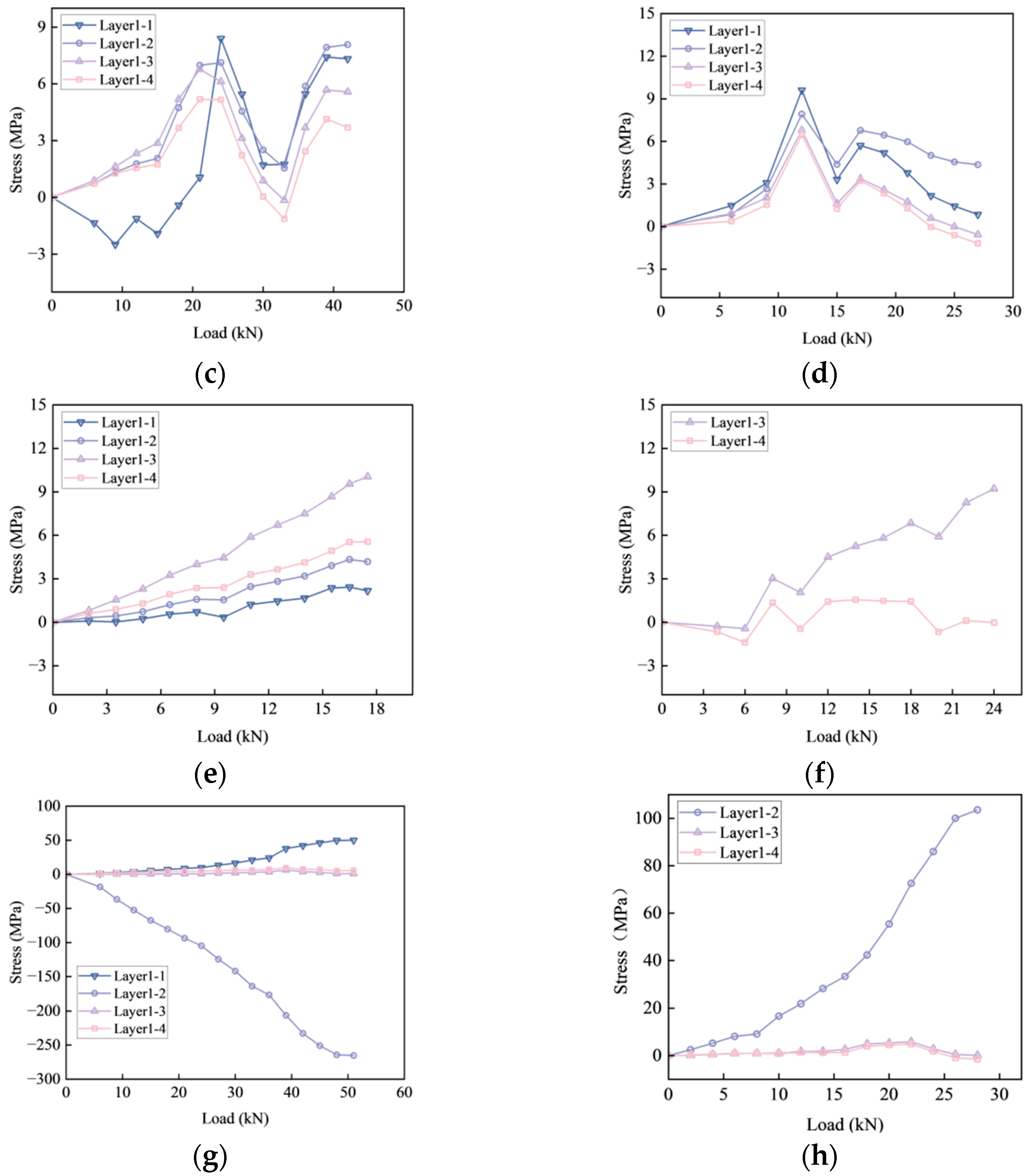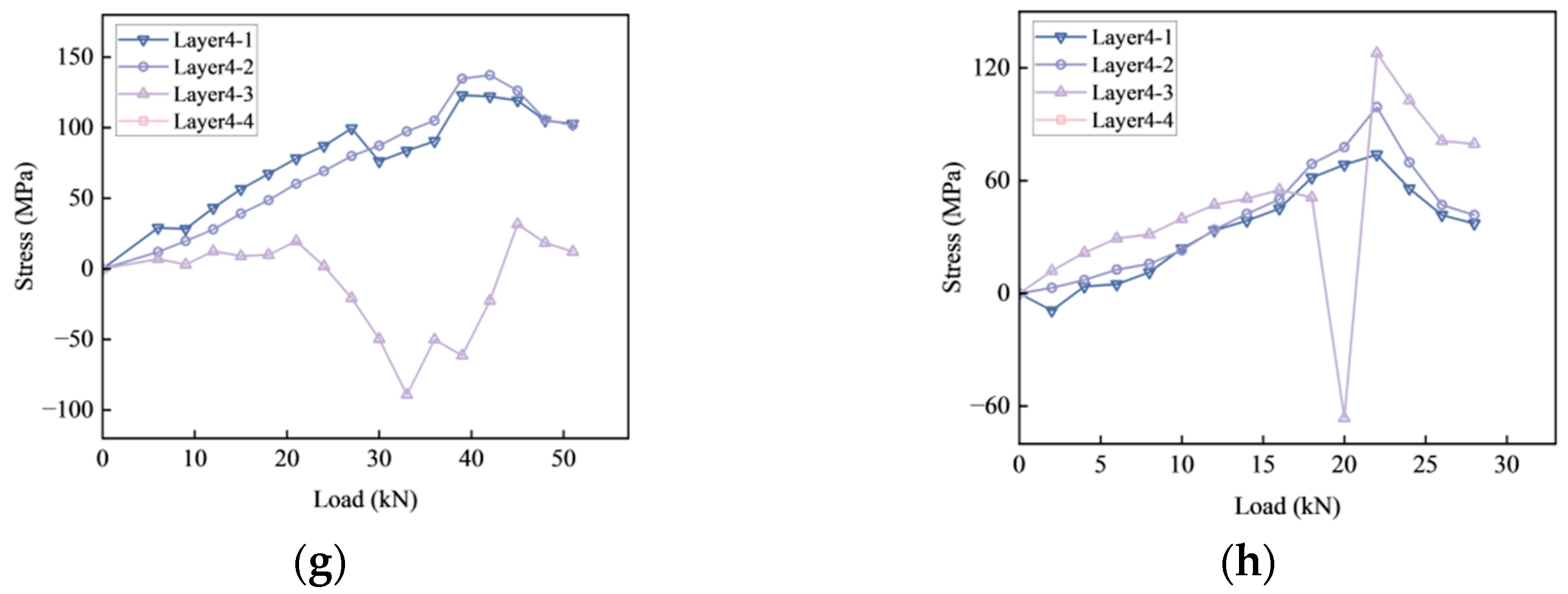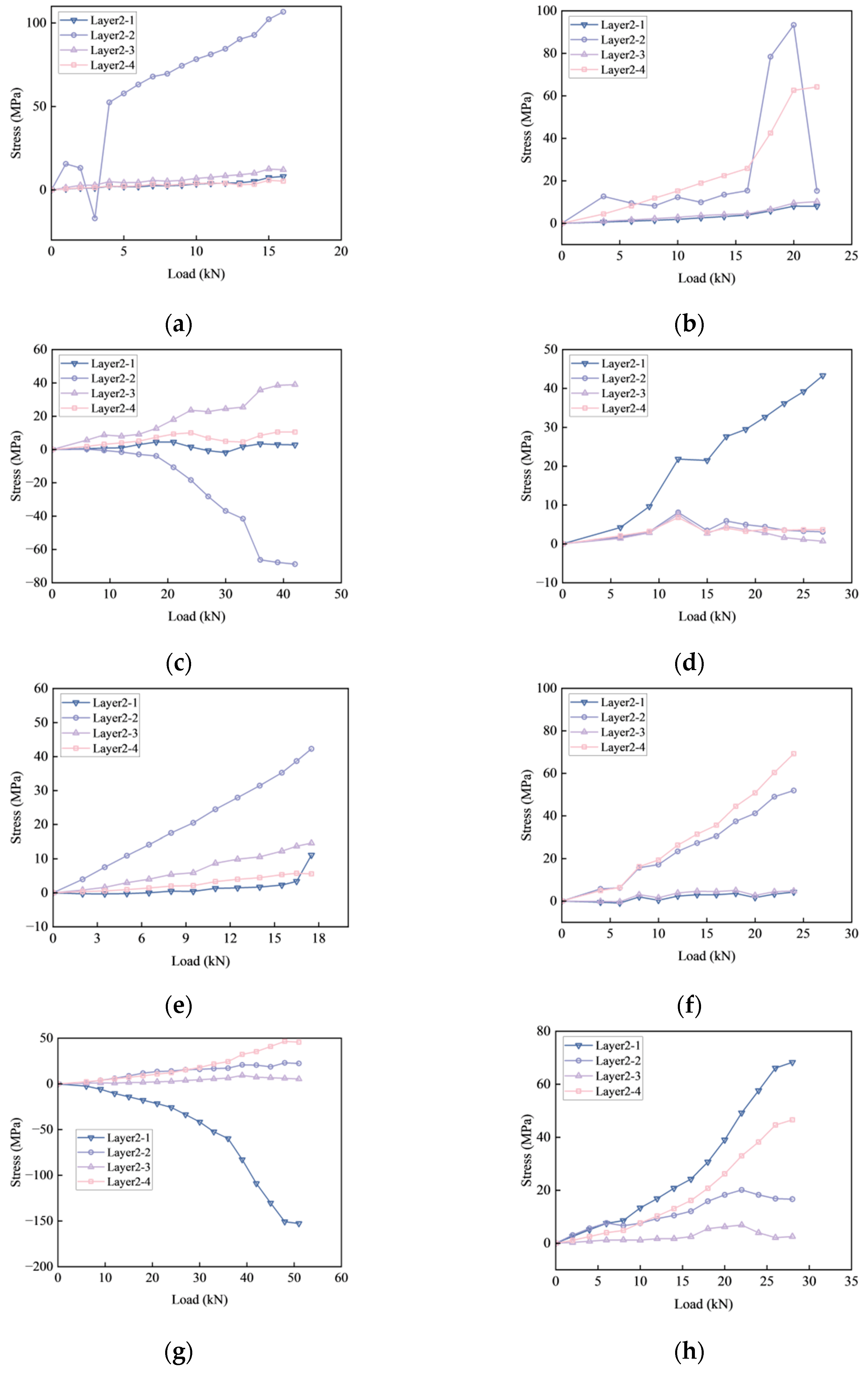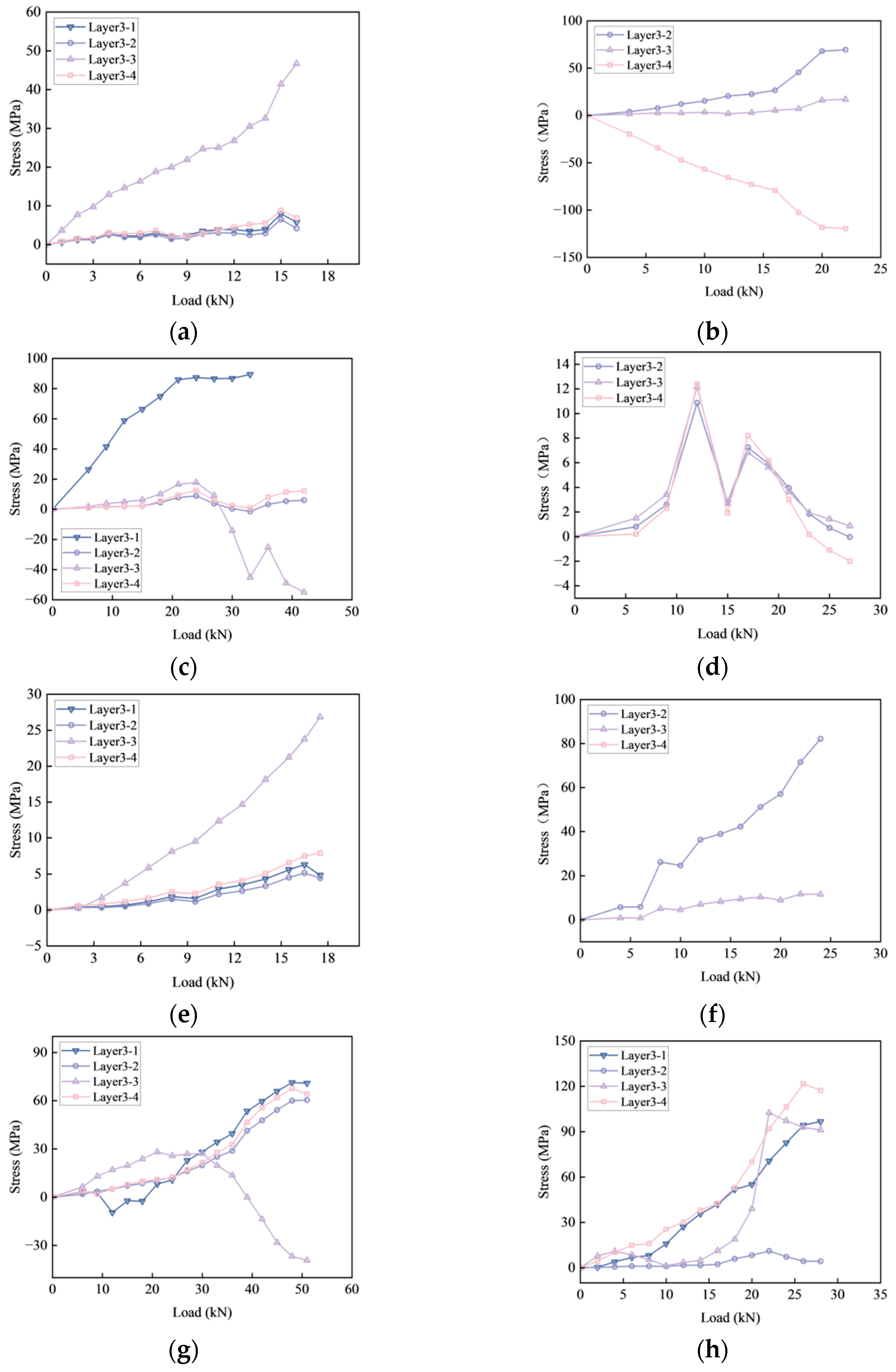 In test cases UWC3 and UWC4, certain stress values peaked within specific load ranges before decreasing, reflecting stress redistribution in these components during loading, possibly indicating a transition in load-bearing mechanism. In most test configurations, the stress increase at measurement point Layer1-1 was substantially greater than at other locations, suggesting potential eccentric loading during force application, which made the I-beam at Layer1-1 the primary load-bearing member carrying disproportionately higher stresses. Stress growth at other measurement points was generally gradual, with virtually no significant stress increase observed at points Layer1-2 to Layer1-4 in UWC8, confirming that these regions carried minimal load.