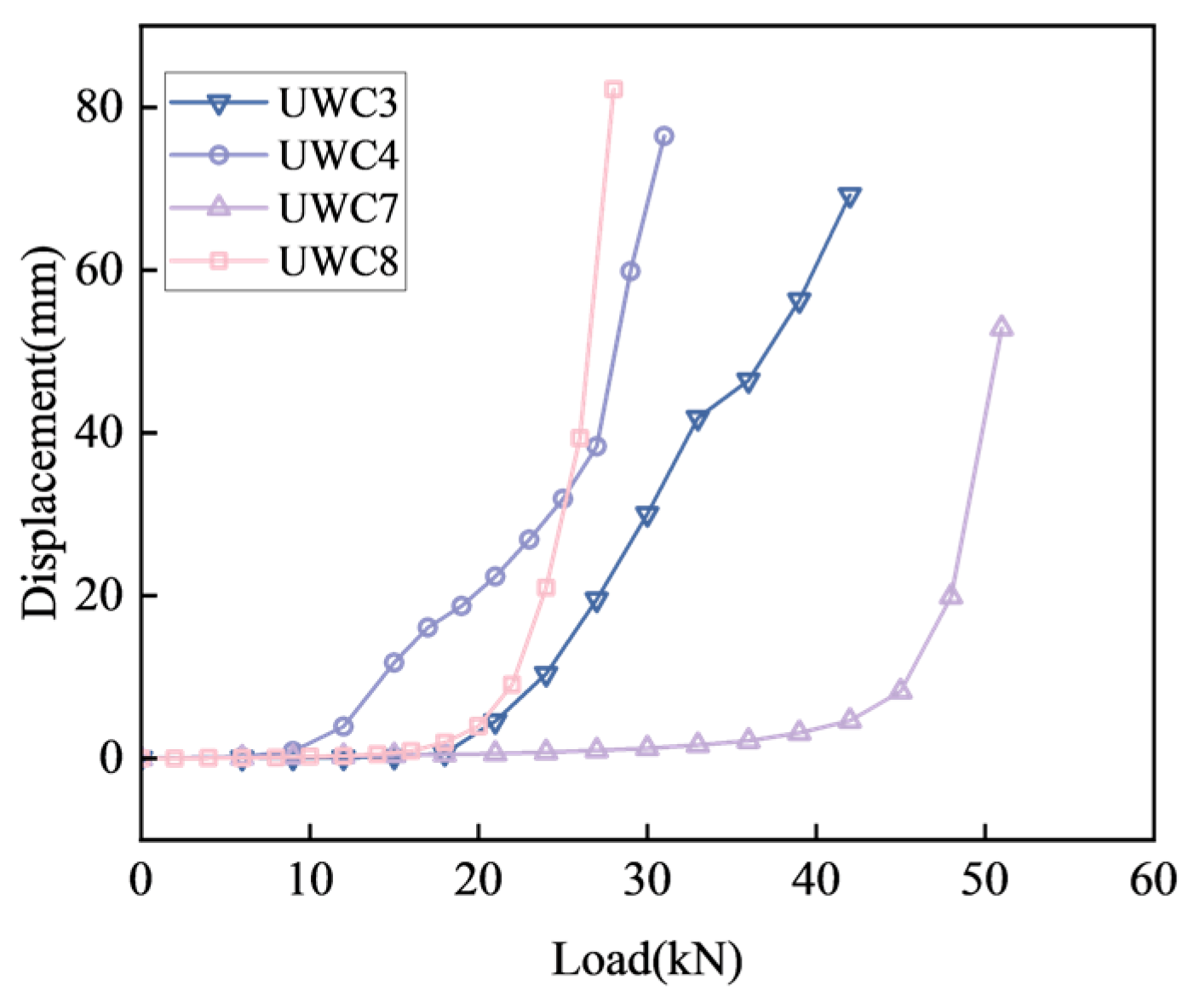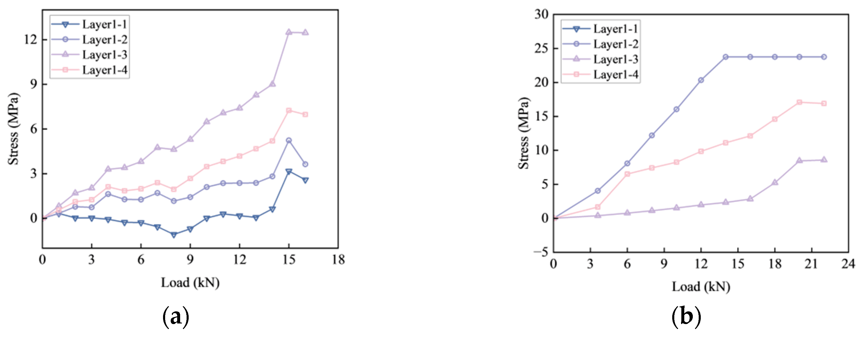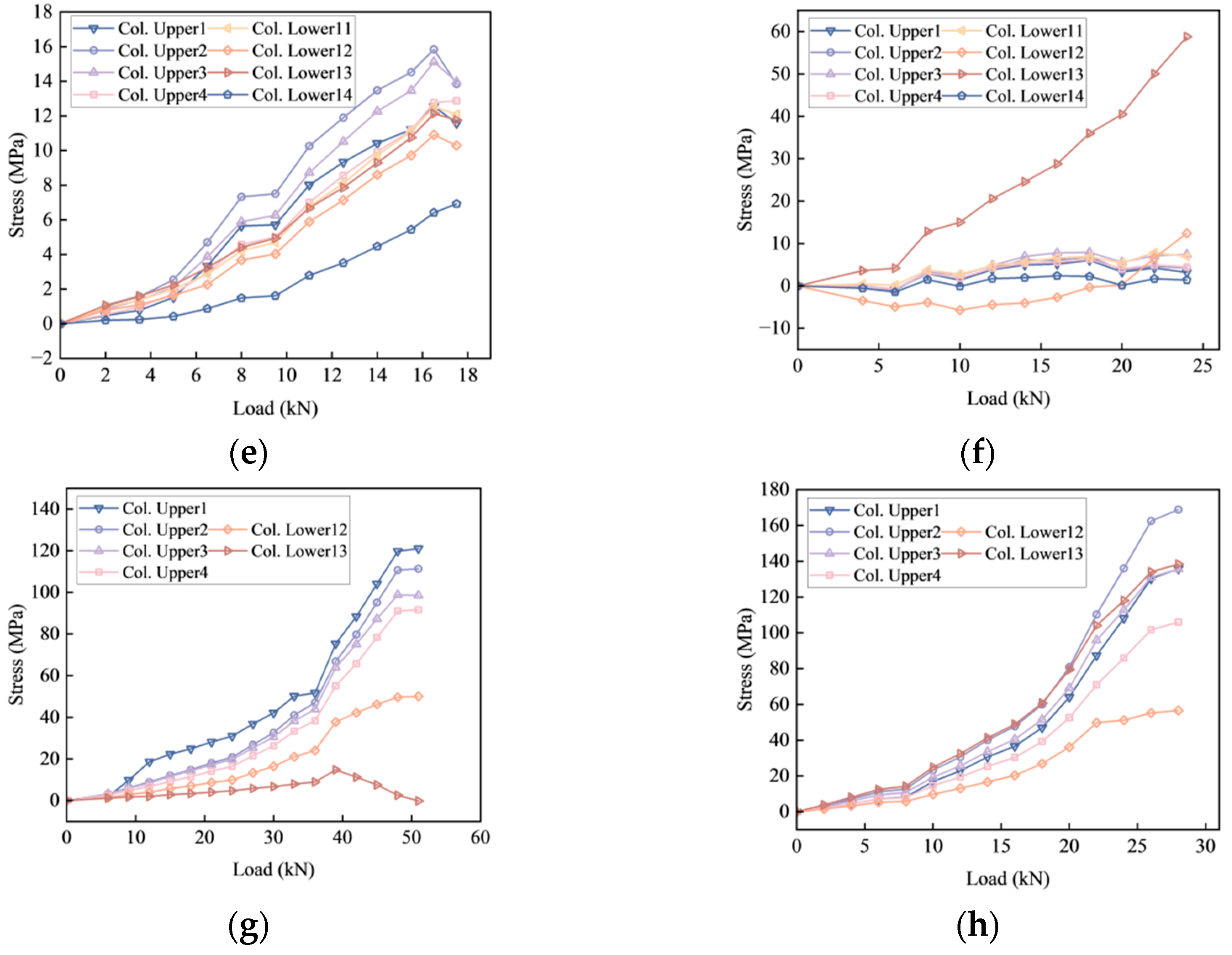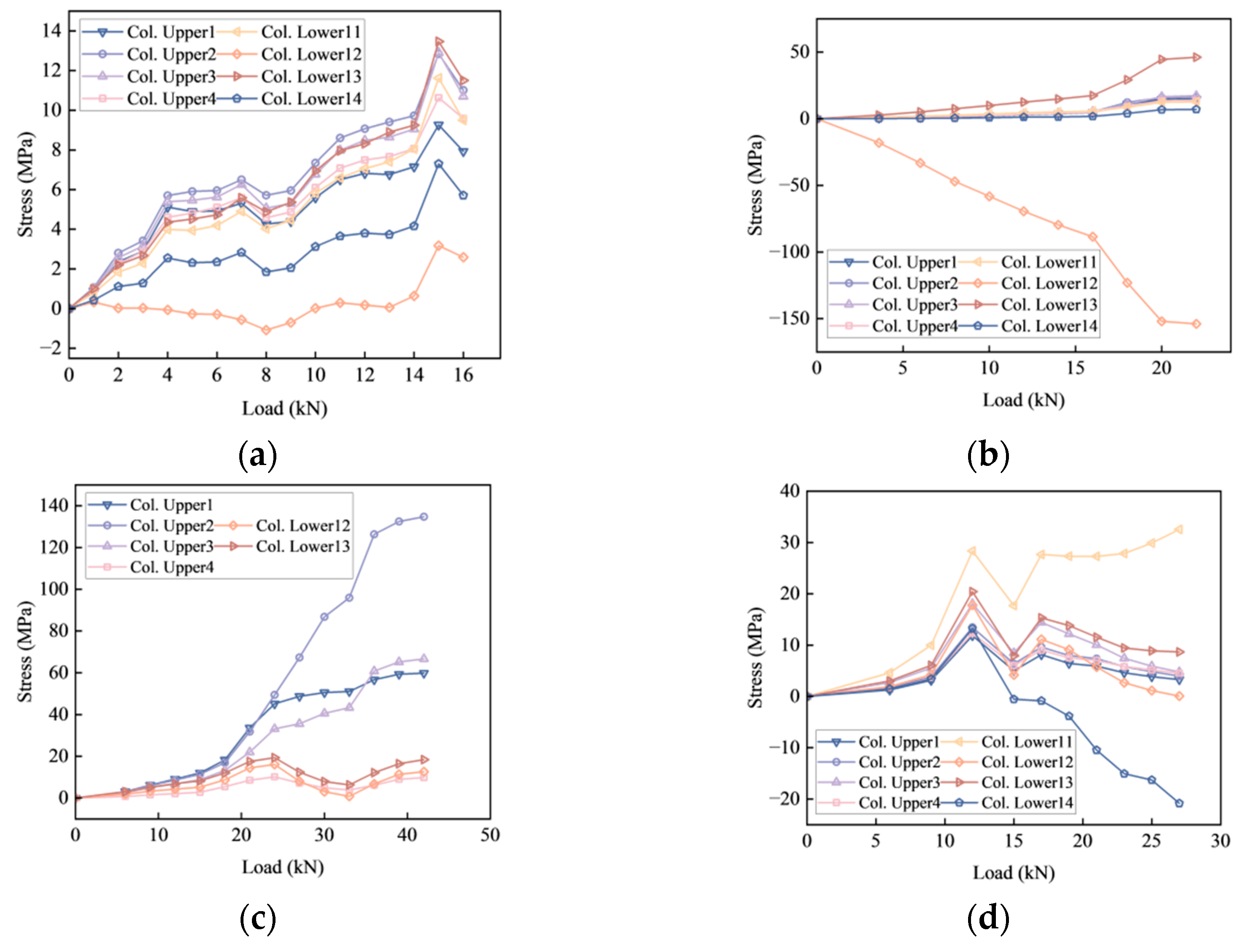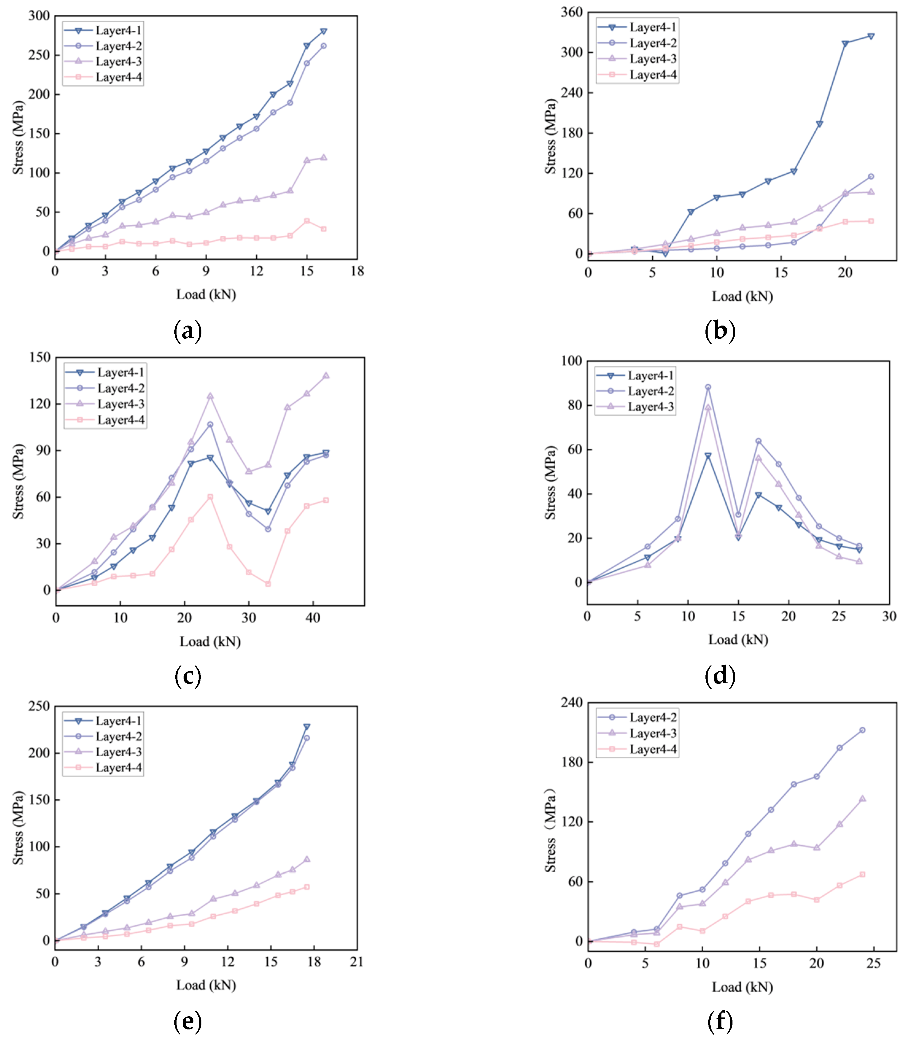 In test cases UWC3 and UWC4, certain stress values peaked within specific load ranges before decreasing, reflecting stress redistribution in these components during loading, possibly indicating a transition in load-bearing mechanism. In most test configurations, the stress increase at measurement point Layer1-1 was substantially greater than at other locations, suggesting potential eccentric loading during force application, which made the I-beam at Layer1-1 the primary load-bearing member carrying disproportionately higher stresses. Stress growth at other measurement points was generally gradual, with virtually no significant stress increase observed at points Layer1-2 to Layer1-4 in UWC8, confirming that these regions carried minimal load.