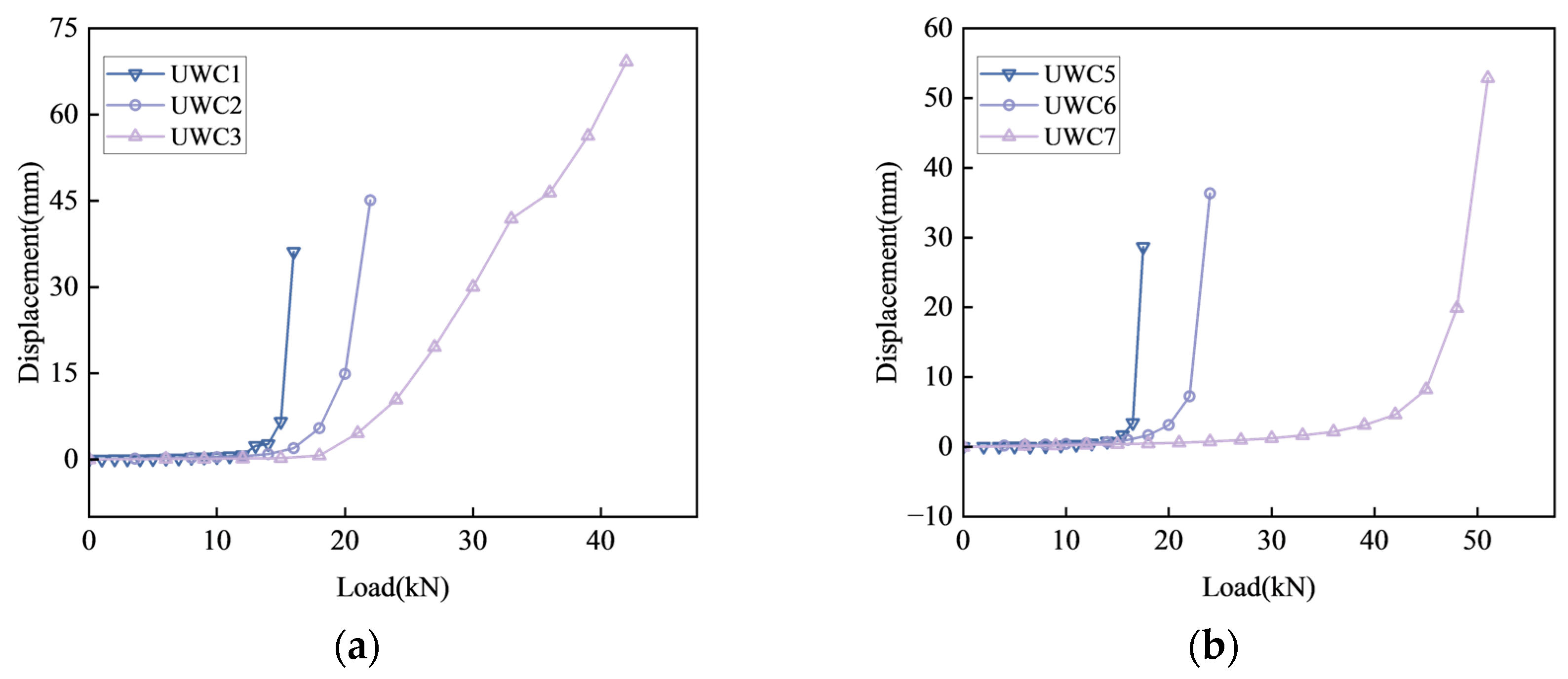 Figure 8b reveals that for weathered sand backfill where particle interlocking and dilatancy effects dominate the load-bearing mechanism, the embedment depth governs the bearing performance by regulating overburden confinement intensity and the effective range of side friction. The initial linear segment of the curve during elastic deformation stage indicates elastic response of the foundation–sand system, where the load is resisted by interparticle frictional resistance and foundation elastic deformation. After exceeding the proportional limit load, the gradually decreasing slope signifies entry into the elastoplastic stage. The stage characteristics show remarkable variation with embedment depth: UWC7 displays pronounced ductile deformation; UWC6 exhibits accelerated plastic development, while UWC5 demonstrates rapid transition to failure stage. The ultimate capacity of UWC7 reaches 48 kN with progressive displacement development (gradual-to-abrupt increase) before failure, characteristic of ductile failure with clear deformation warning. UWC6 achieves about 22 kN capacity followed by steep displacement increase, showing shorter warning period. UWC5 attains merely 16.5 kN capacity with near-vertical displacement surge after peak load, approaching brittle failure with minimal warning. The 191% improvement in ultimate capacity when embedment depth increases from 0.5 m to 1.2 m demonstrates that increased embedment depth is a highly effective technical measure for enhancing bearing capacity in granular backfill.