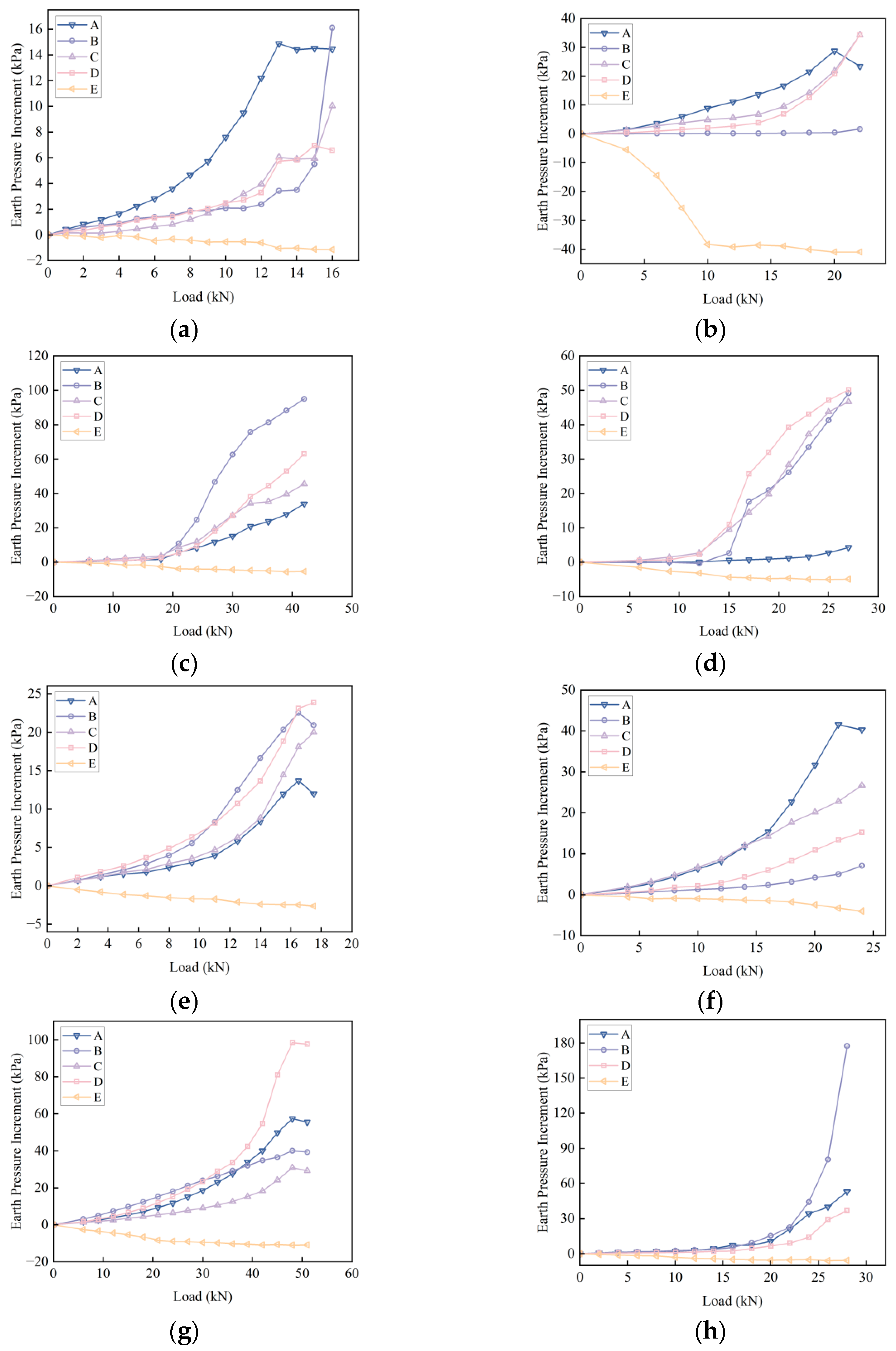 Figure 9, under identical loading conditions, the magnitude of earth pressure increments may vary among different measurement points due to foundation placement position, backfill soil heterogeneity, and minor deviations in load application. Nevertheless, all measurement points exhibit identical trends, showing progressive increase with external load. Since the E# earth pressure cell is positioned beneath the foundation base plate, it primarily sustains the self-weight of the overlying foundation and soil mass under uplift loading. Consequently, the earth pressure at the E# measurement point initially demonstrates a minor decrease before stabilizing throughout the test.