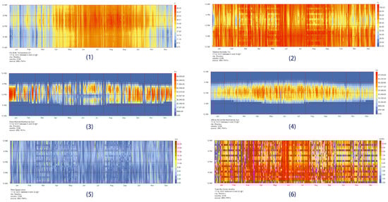 Climatic Data of Shantou Region. (1) Dry bulb temperature; (2) Relative humidity; (3) Direct normal illuminance; (4) Diffuse horizontal illuminance;(5) Wind speed; (6) Total sky cover.