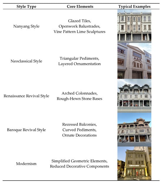 The eclectic characteristics of the Xiaogongyuan arcades serve as material witnesses to cultural collisions across different periods, concretely manifested through the coexistence of multiple architectural styles. This stylistic hybridity is not a mere patchwork but a sophisticated reorganization based on practical functionality and aesthetic expression. The ground level incorporates Nanyang-style open corridors, where continuous arcades combined with adjustable wooden louver systems form a passive climate adaptation strategy for subtropical conditions. The upper facades, meanwhile, skillfully employ simplified classical orders and decorative pediments, achieving a localized interpretation of Western architectural aesthetics through proportional adjustments. The stylistic features of the Xiaogongyuan arcade facades are detailed in the figure below (Figure 5).