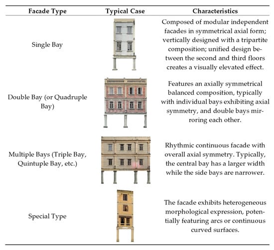 The facades of Xiaogongyuan arcades predominantly adopt a tripartite design approach, reflecting rich cultural layering. The ground level features neatly arranged simplified European classical orders as structural supports. The middle section consists of walls, windows, and decorative elements, with some arcades incorporating recessed balconies at the top. The uppermost section is composed of parapets and pediments. Common column styles include simplified Tuscan and Ionic orders, typically with wider central spans. Bay divisions are determined by the number of columns, commonly appearing as single, double, triple, or quintuple bays. The wall surfaces in the middle section skillfully integrate diverse Western classical architectural styles with traditional Chaoshan decorative components. Wall materials exhibit rich variety, accompanied by windows of varying designs. Typical layouts feature one window per bay or two windows per bay. In most cases of single- or double-window configurations, the columns corresponding to the wall sections are embedded within the walls, employing quasi-Doric or square composite designs that enhance structural stability while maintaining aesthetic harmony. The uppermost pediments and parapets combine traditional Chaoshan patterns with Rococo influences, forming a unique and regionally distinctive decorative style that highlights the defining characteristics of Shantou’s modern architecture. Specific arcade facade typologies are detailed in the figure below (Figure 6).