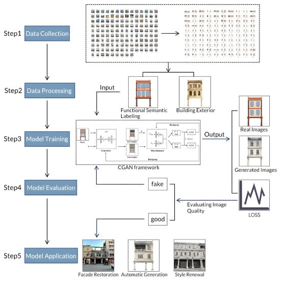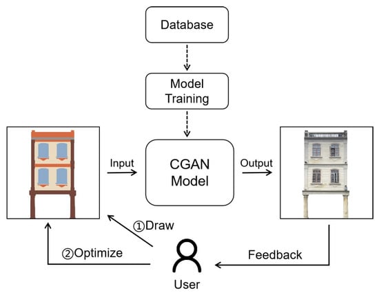 The Conditional Generative Adversarial Network (CGAN) was proposed to achieve precise control over generation by integrating auxiliary information, thereby allowing for accurate regulation of the outputs. This characteristic makes it particularly suitable for the conservation and renewal of historic districts in the architectural field: CGAN accomplishes class-conditional image generation [29], capable of generating building facades based on input conditions such as historical district decorative styles [30], while effectively learning and summarizing architectural characteristics of specific cities to achieve precise contextual continuity and stylistic control [31]. By modifying the input dataset, CGAN can also accomplish the generation of floor plan designs [32]. CGAN demonstrate significant potential in empowering the digital restoration of architectural heritage. However, when confronted with the highly diverse stylistic decorations and complex components of historic buildings, the adaptability and refinement of current techniques require further development. This challenge precisely constitutes the main direction and untapped potential for future research.