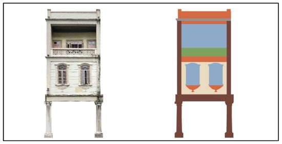 (1) Valid samples will be imported into CAD and Adobe Photoshop 2021 for correction, brightness adjustment, and other processing to convert them into line drawings. During the preprocessing stage, temporary attachments (such as billboards) must first be removed to ensure the integrity of facade features. After processing, the samples undergo color separation treatment, using different color blocks to distinguish architectural facade elements, ultimately generating Functional Segmentation Layout (FSL) diagrams. Based on the compositional characteristics of Xiaogongyuan arcade facades, main facade elements are divided into four categories, marked with distinct colors in this study: colonnades in dark brown (R116, G69, B59), decorative components in bright orange (R213, G105, B66), windows in light blue (R141, G170, B200), and walls in light yellow (R234, G218, B192). Additionally, light gray (R146, G148, B147) for roofs and green (R125, G162, B95) for railings will serve as supplementary elements in the annotation. Specific color coding specifications are detailed in the figure below (Figure 10).