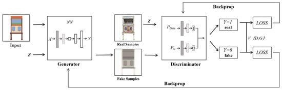 Deep learning is an important branch of machine learning, and since its breakthrough in 2012, it has achieved remarkable results in fields such as image recognition and natural language processing [15], with widespread applications in various aspects of digital architectural design. Among diverse deep learning models, Generative Adversarial Networks (GANs) initially gained attention for their exceptional image generation capabilities and efficiency [16], and are increasingly being utilized in architectural heritage conservation [17,18,19,20,21]. The framework employs artificial neural networks [22], primarily composed of a generator and a discriminator, which engage in mutual adversarial training and iterative optimization to ultimately produce highly realistic synthetic data [23]. Furthermore, various improved models derived from GANs, such as CycleGAN [24,25], CAIN-GAN [26], and pix2pix [27,28], have demonstrated powerful image generation and style transfer capabilities in the architectural domain, further expanding the application prospects of artificial intelligence in architectural design, conservation, and innovation.