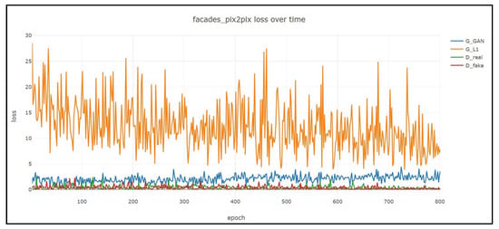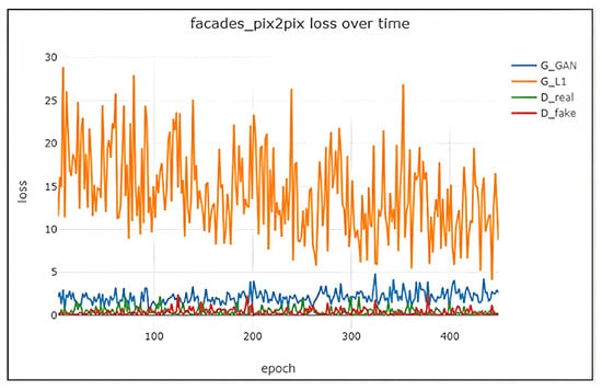 (3) Model Training: After completing the data processing, this study uses the pix2pix algorithm model to generate historical building facade images with the specific style of a small park. The selection of pix2pix was based on several key considerations, primarily because this study possesses paired training data that aligns perfectly with the supervised learning framework of pix2pix. Furthermore, its deterministic output characteristic proves advantageous over stochastic generative models by better preserving the accuracy of key façade structures. Additionally, the model’s technical maturity is well-demonstrated through its successful application in precedents of architectural image translation tasks. The model is an image translation model based on Conditional Generative Adversarial Networks (CGAN), which learns the mapping relationship between functional layout diagrams and real facade images through the adversarial training mechanism between the generator and the discriminator. During the model training process, the generator and discriminator continuously optimize parameters to minimize the differences, ensuring that the generated facade retains the accuracy of the original structure while incorporating authentic and natural architectural style characteristics, thus achieving the digital generation and preservation of the historical building’s appearance.