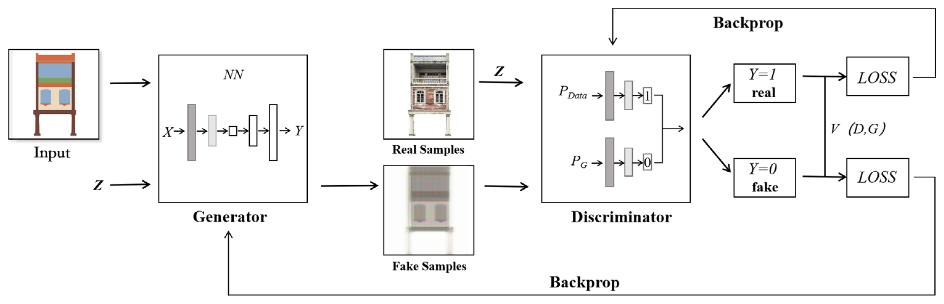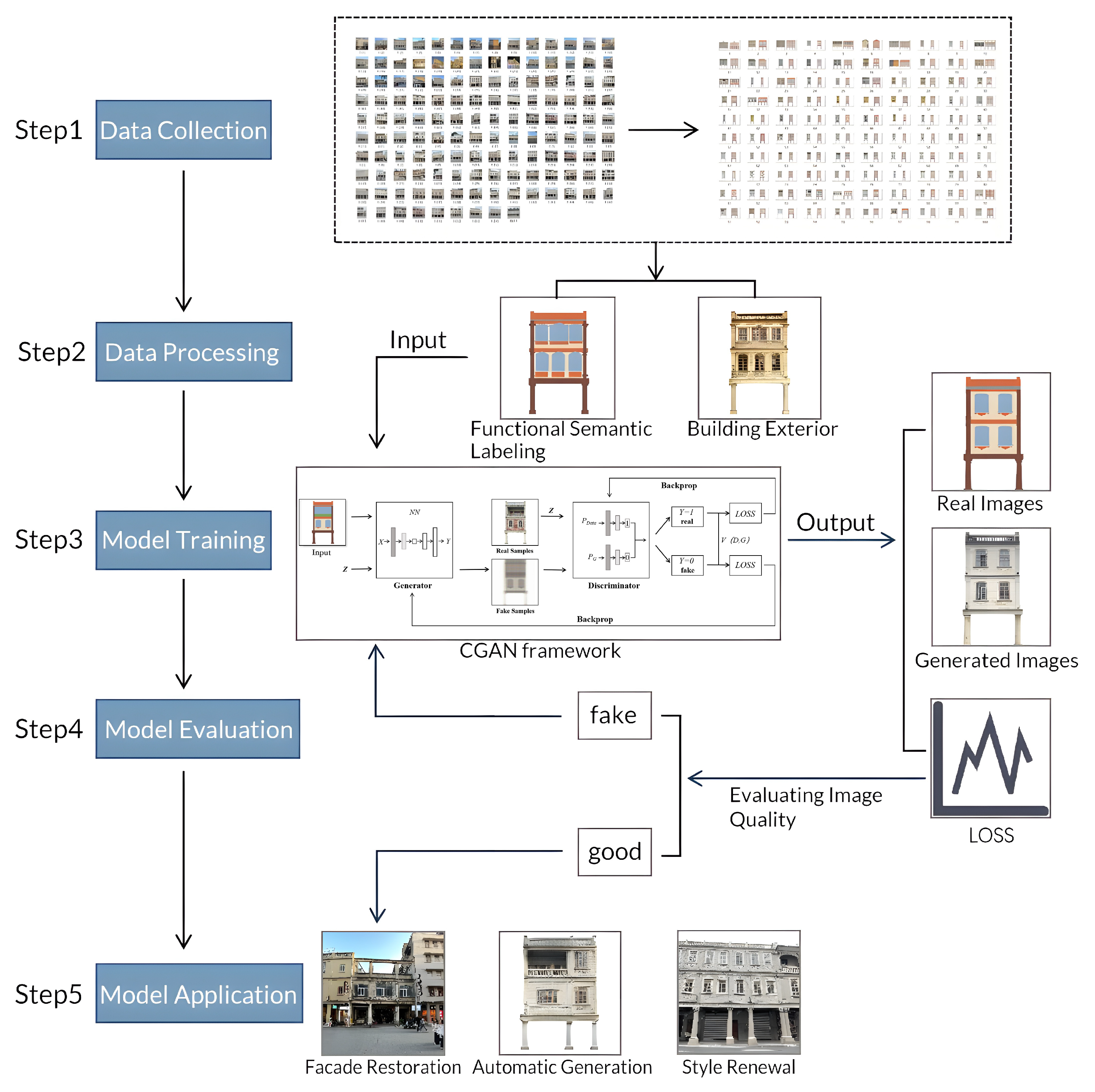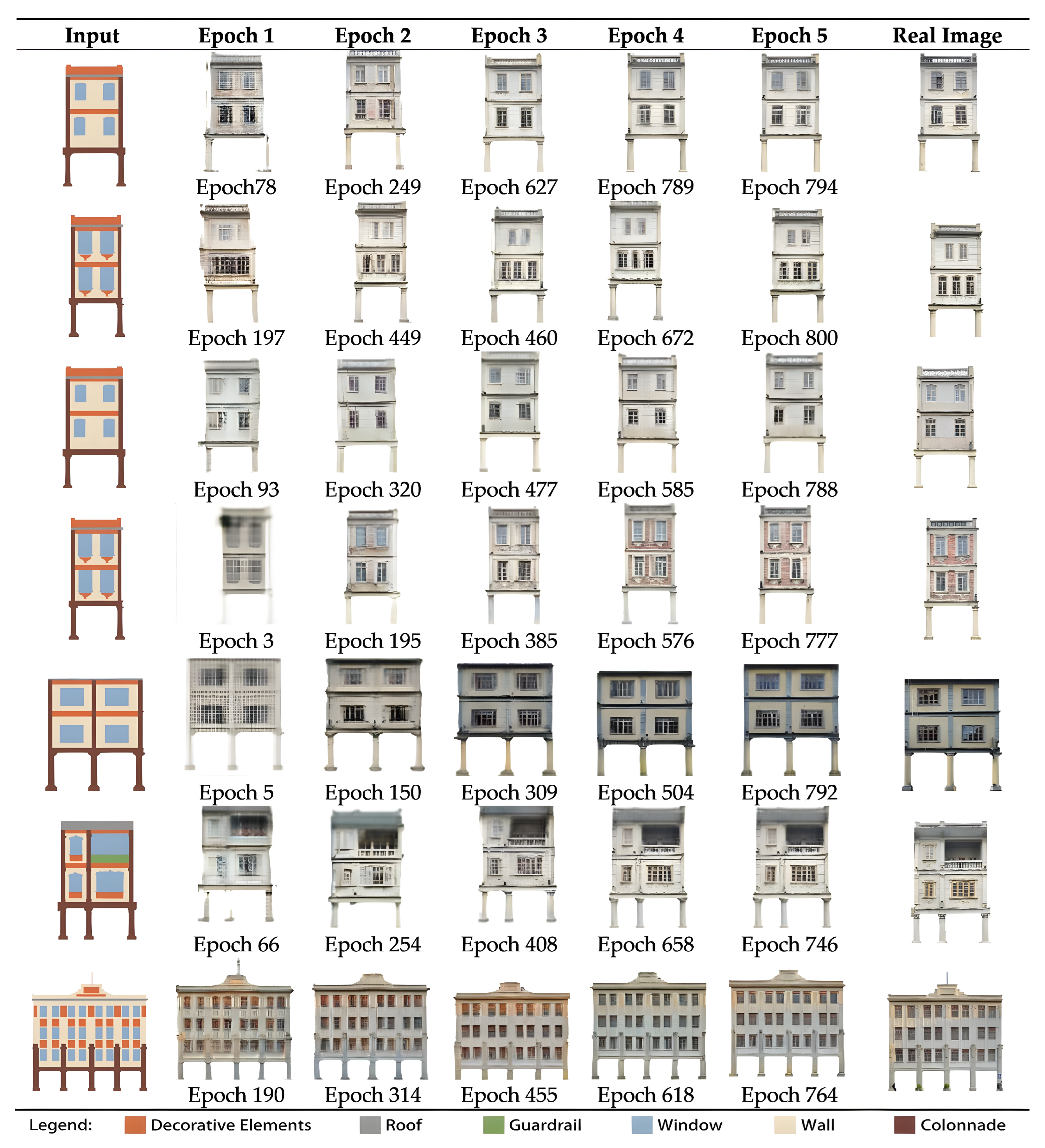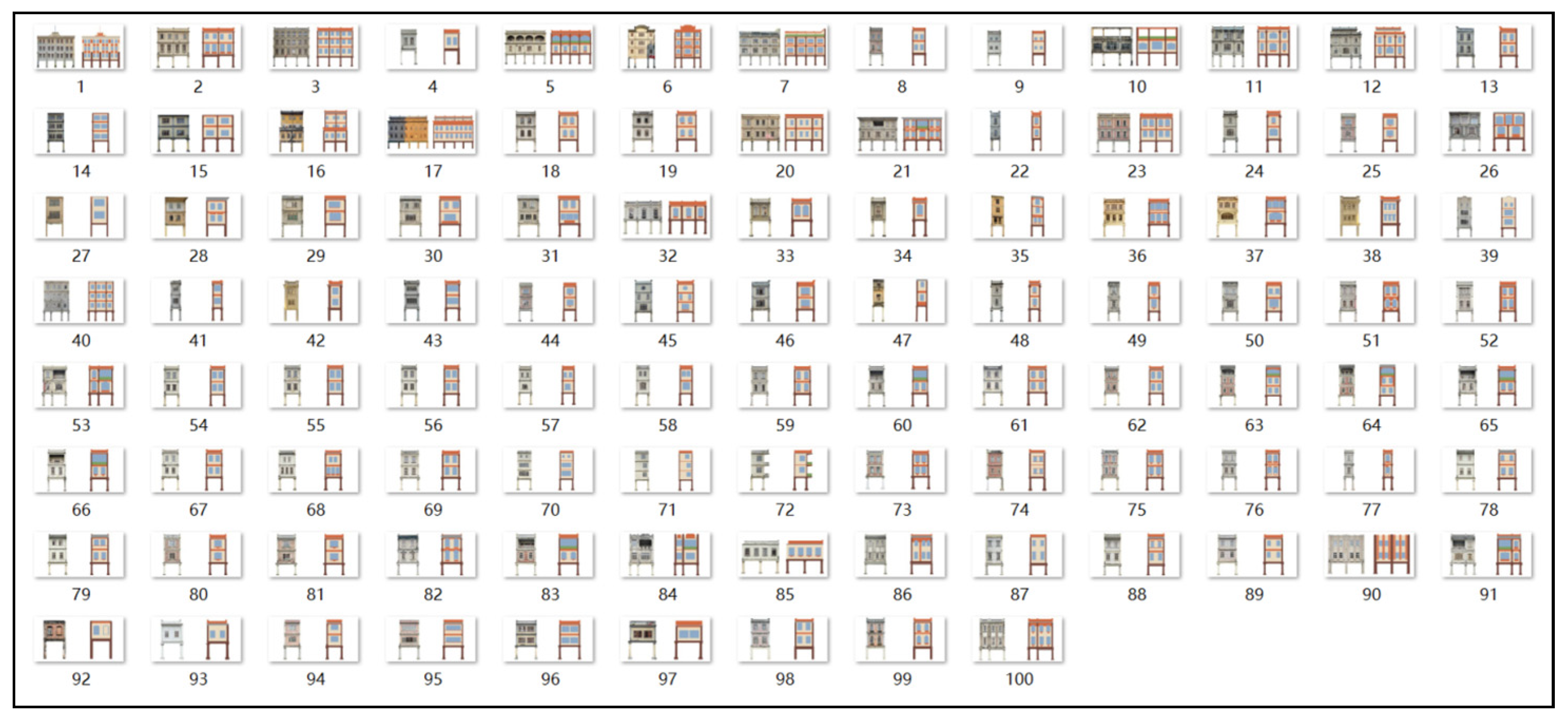 - Lin, H.; Huang, L.; Chen, Y.; Zheng, L.; Huang, M.; Chen, Y. Research on the Application of CGAN in the Design of Historic Building Facades in Urban Renewal—Taking Fujian Putian Historic Districts as an Example. Buildings 2023, 13, 1478. [Google Scholar] [CrossRef]