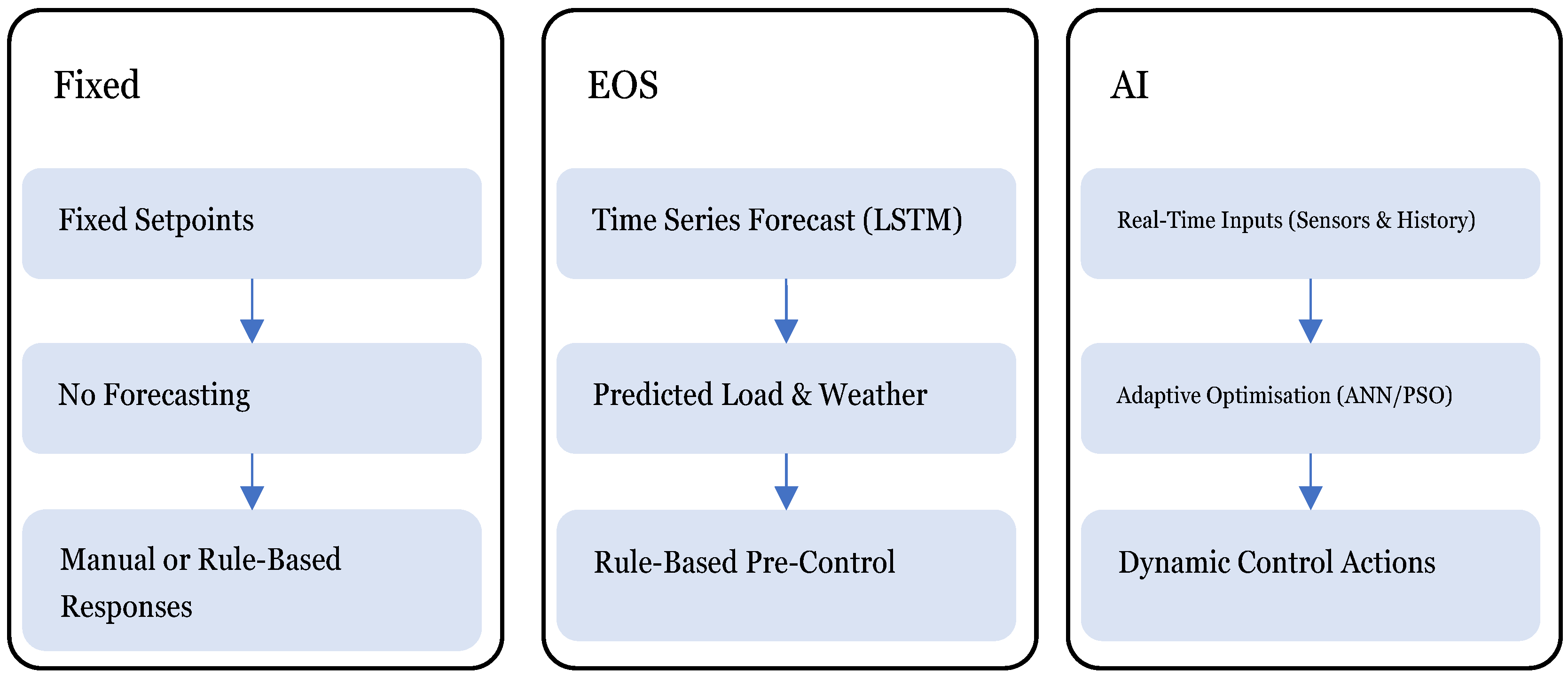 Within the digital twin framework, the Fixed Mode was modelled by enforcing deterministic control logic derived from historical operational patterns. This approach assumes no predictive capability or adaptive behaviour: equipment operation remains fixed regardless of short-term variations in ambient temperature or internal load. As a baseline strategy, the Fixed Mode serves as a reference point for evaluating the potential improvements introduced by more intelligent, data-driven control modes such as EOS and AI. However, due to its rigid nature, the Fixed Mode often results in operational inefficiencies—particularly under part-load conditions or during mild weather—where equipment may run unnecessarily or spaces may be overcooled to maintain conservative safety margins.