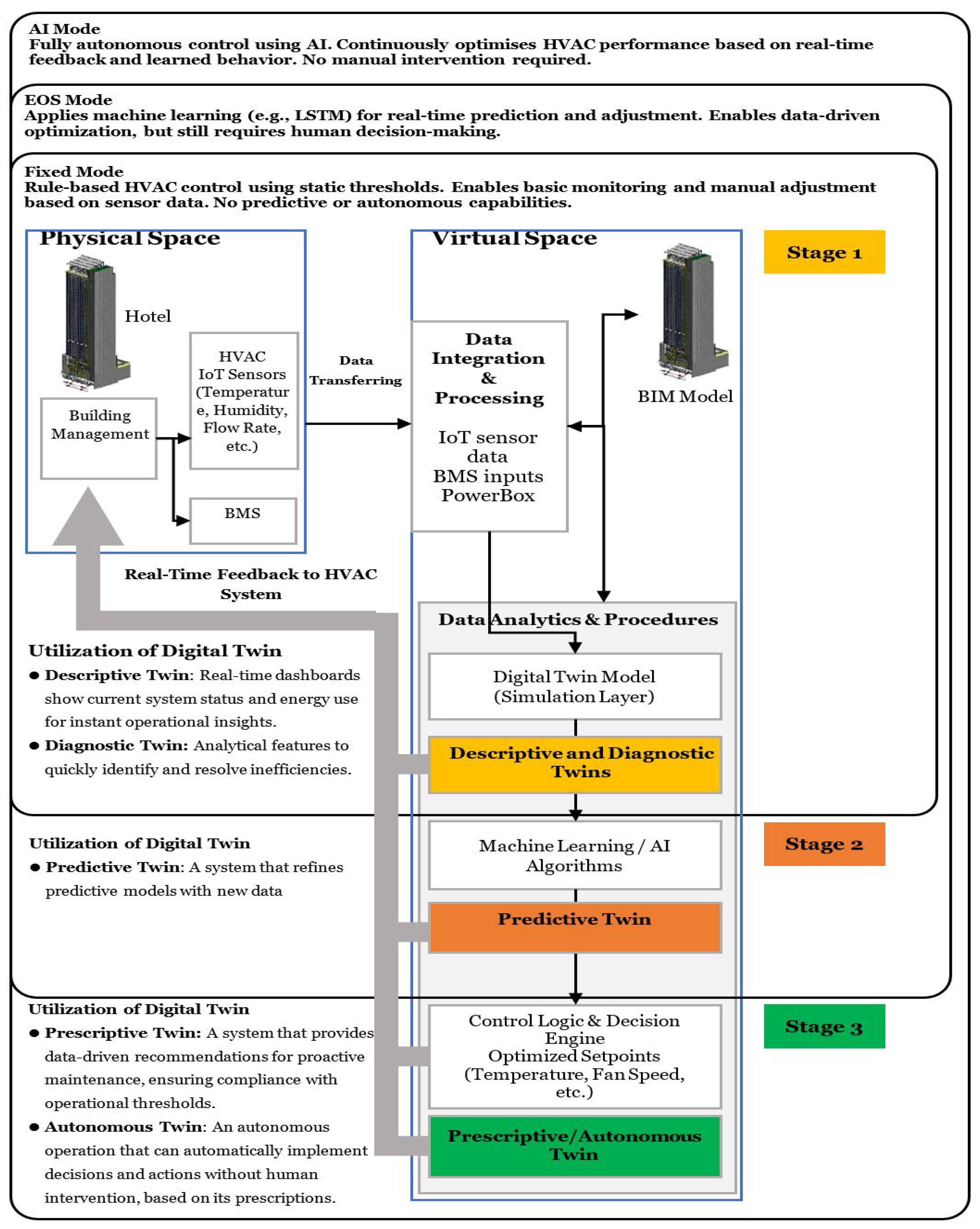 At the core of this framework is the bidirectional relationship between the physical (hotel building and HVAC systems) and virtual space (digital representation). In the physical space, the hotel’s HVAC system comprises the central chiller plant, cooling towers, and associated pumps and equipment. The virtual space contains the digital representation of the physical system, providing precise geometric and parametric information about the HVAC components. The data integration layer, implemented on cloud infrastructure, serves as the nexus connecting physical and virtual spaces. Data analytics procedures process this integrated information to enable increasingly sophisticated capabilities specific to each stage of digital twin implementation. Theoretically, we propose three stages of digital twin development, each focusing on different capabilities of digital twins in applications [