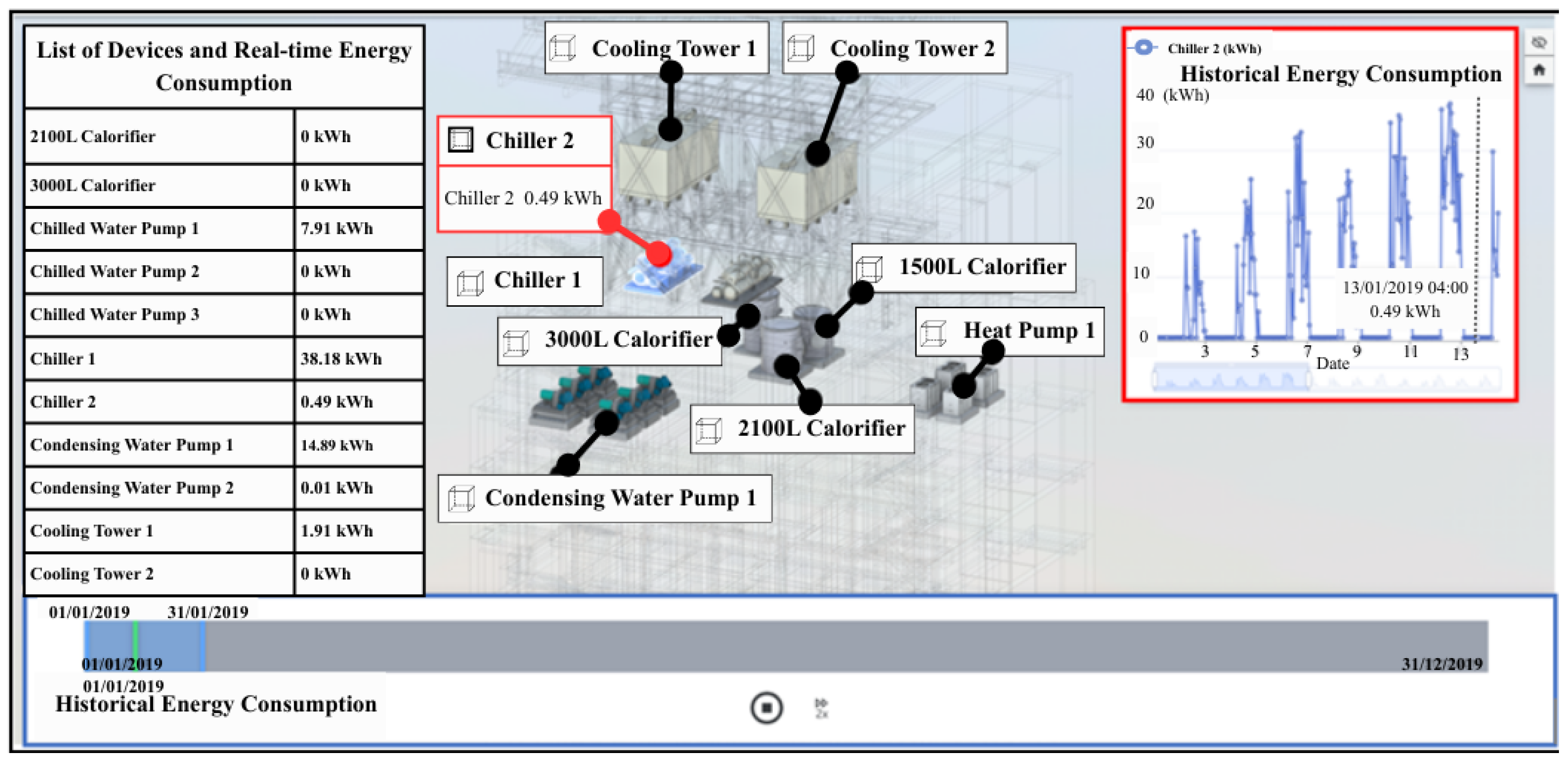 Figure 3, the interface features a 3D layout of the system, displaying real-time energy consumption values for each major component. Historical energy trends are also accessible for diagnostic analysis; however, the system lacks forecasting capabilities or automated recommendations. Control is entirely manual and rule-based, with no adaptive logic or predictive analytics in place. This configuration reflects a traditional static control logic, where predefined temperature setpoints remain fixed regardless of ambient conditions or system demand. Serving as a baseline for comparison with more advanced strategies, the Fixed Mode offers insight into system behaviour, energy consumption, and performance trends without leveraging any predictive models or real-time optimisation techniques.