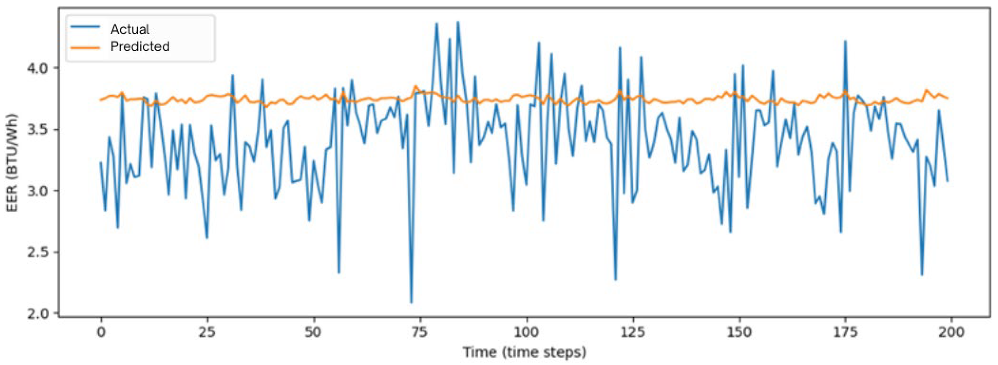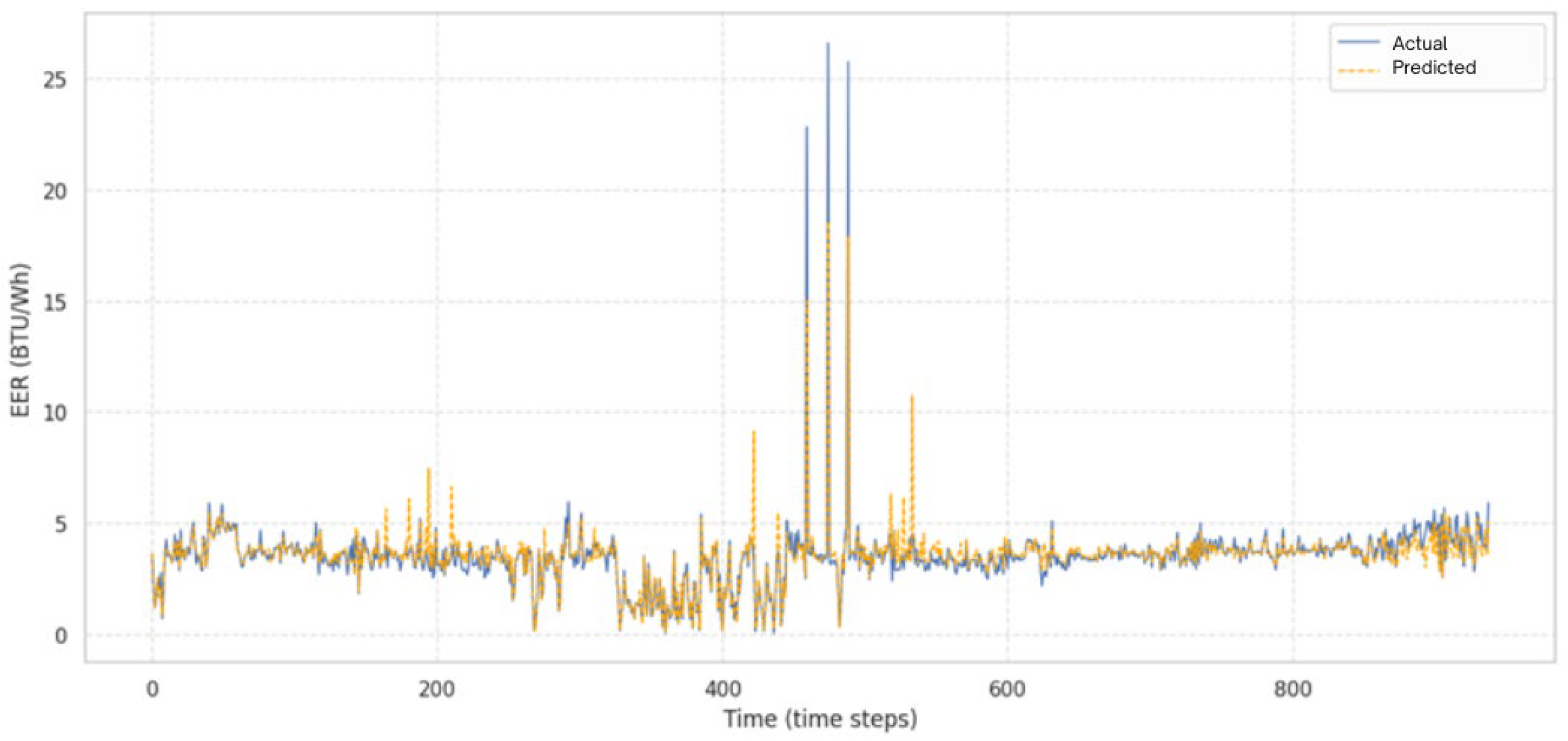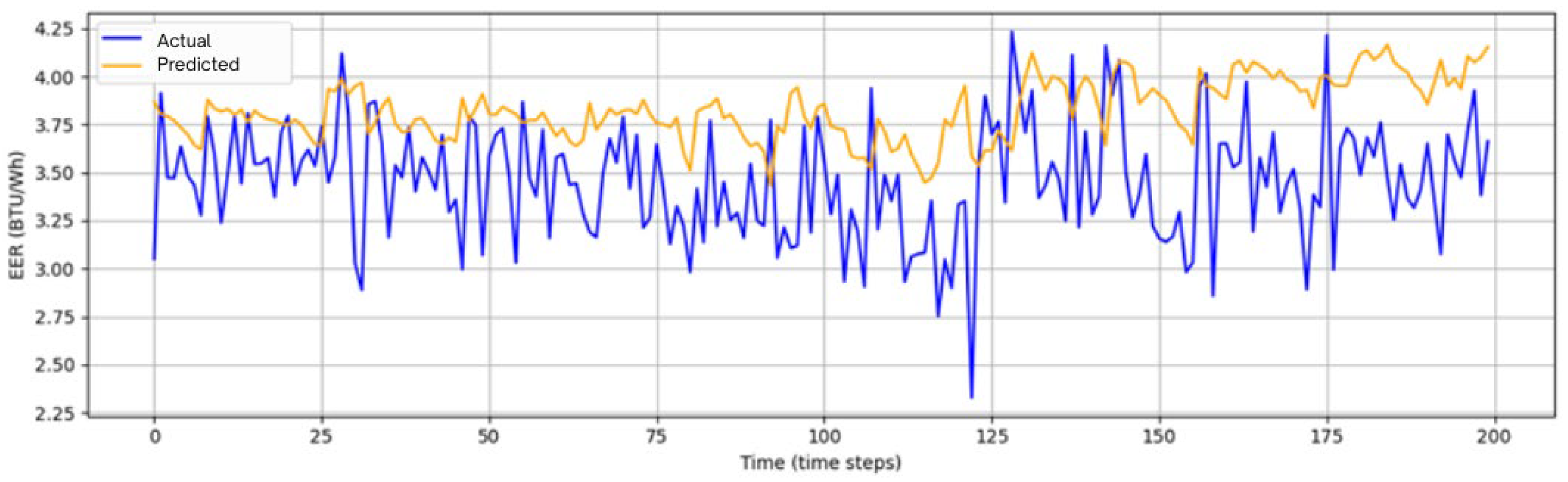 In Stage 2 (EOS Mode), we integrated a predictive LSTM model to estimate EER in real time. The LSTM captured the underlying efficiency trends without overreacting to short-term fluctuations (predicted EER remained around 3.9–4.1 BTU/Wh while measurements varied, see
