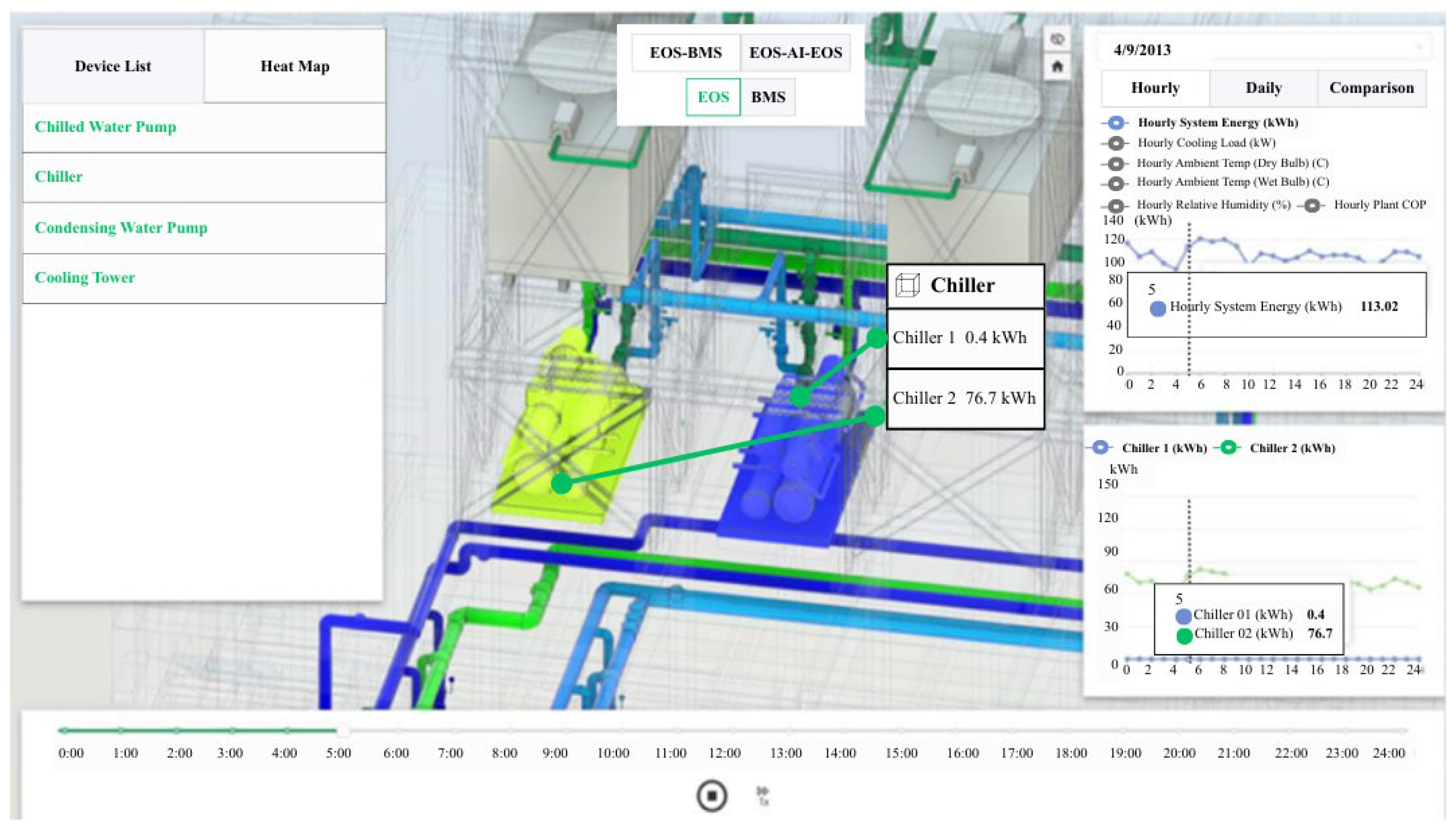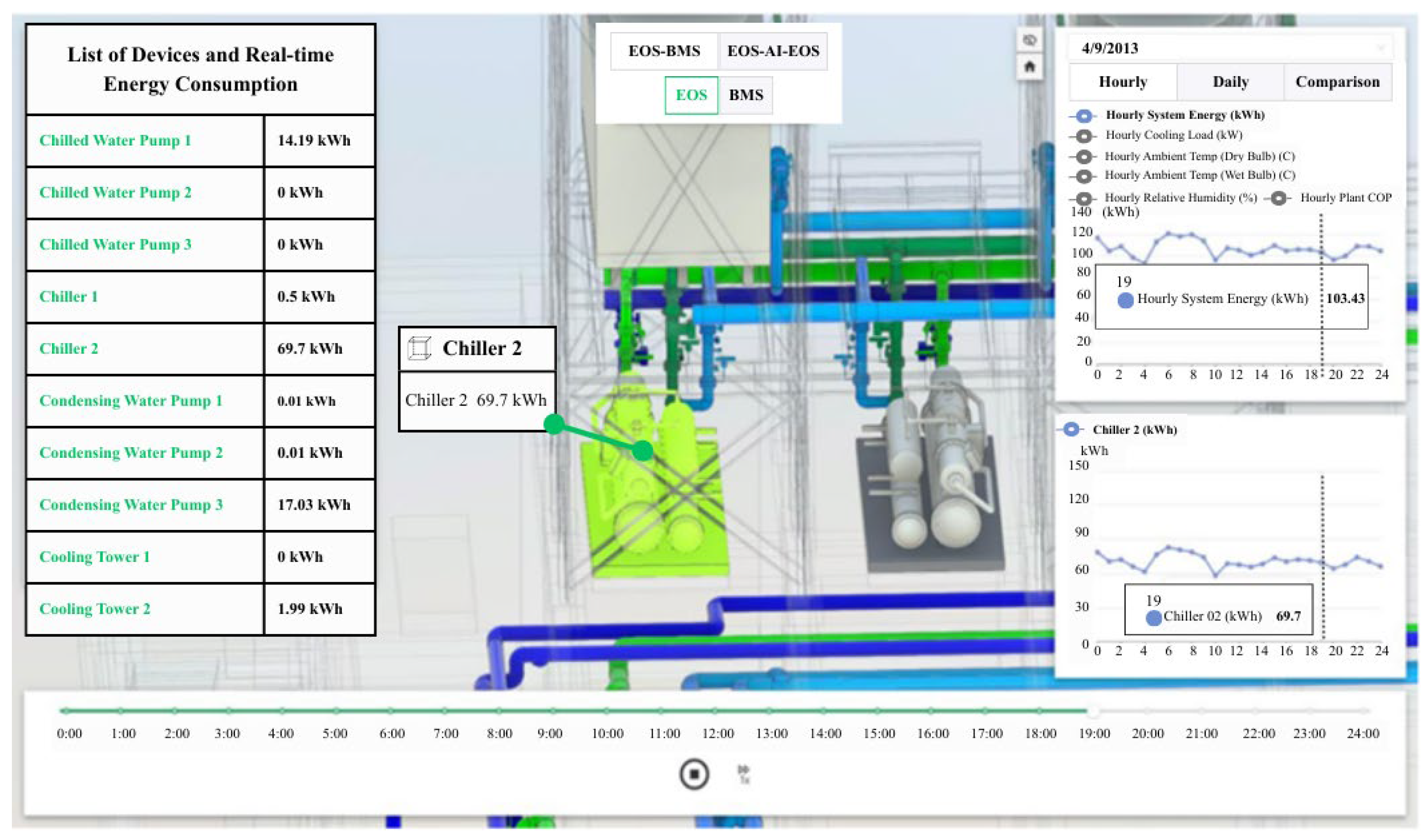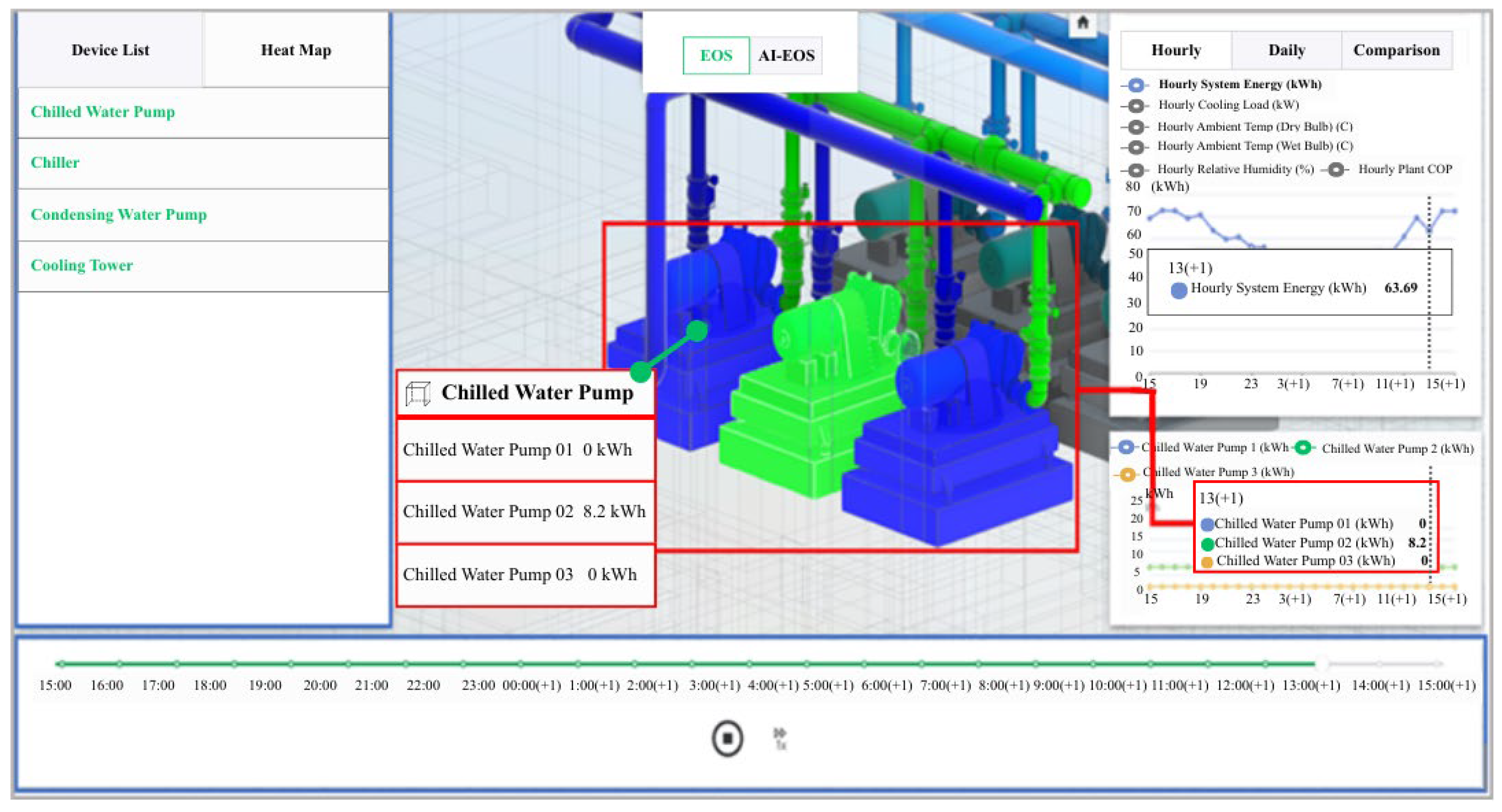 Table 1 shows the characteristics of the sensors, ranging from energy meters, flow sensors, temperature probes, to equipment status indicators. These sensors measure energy consumption at 15-min intervals using kWh meters installed on chillers and pumps. This comprehensive sensor network provides high-resolution data necessary for accurate digital twin operation. A detailed diagram is shown in