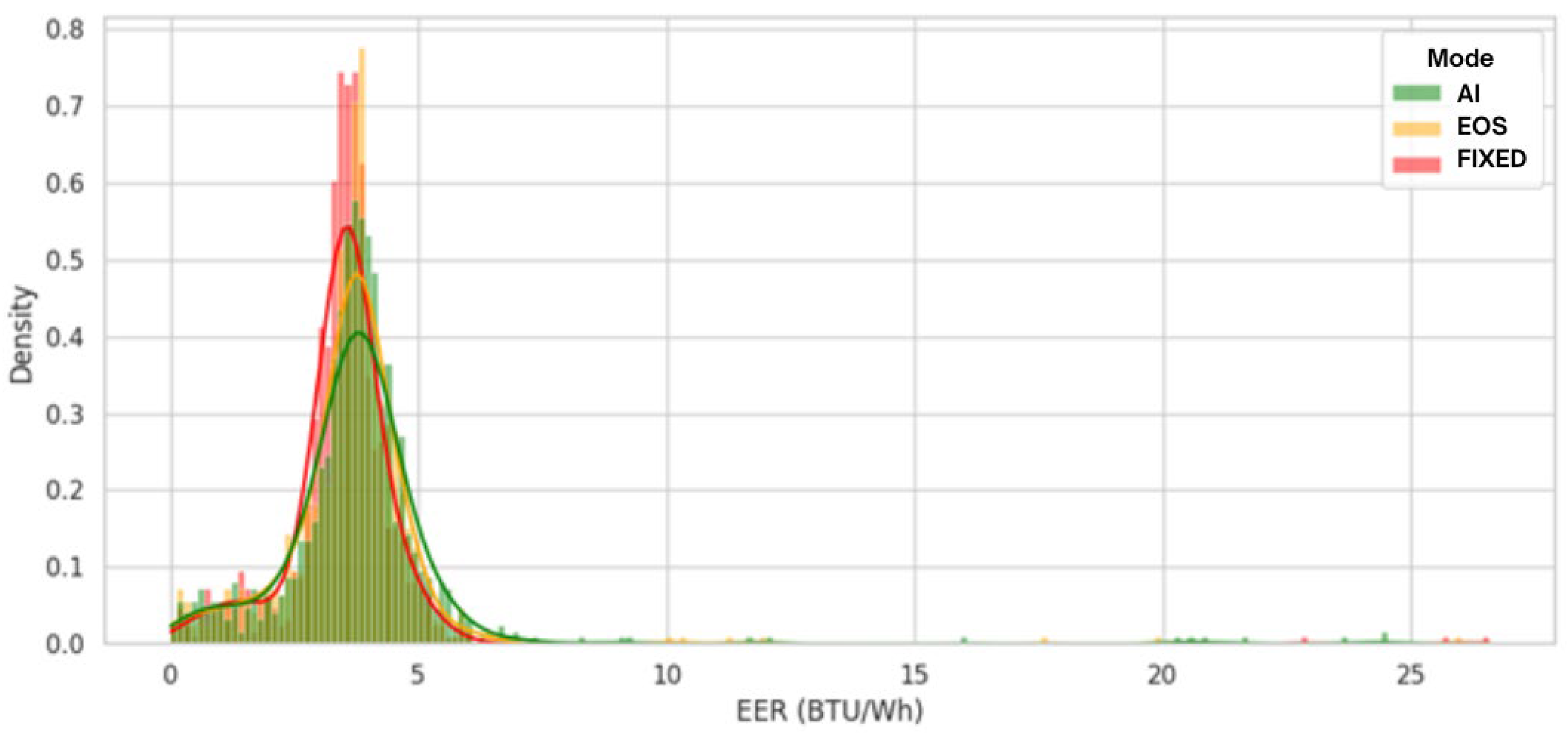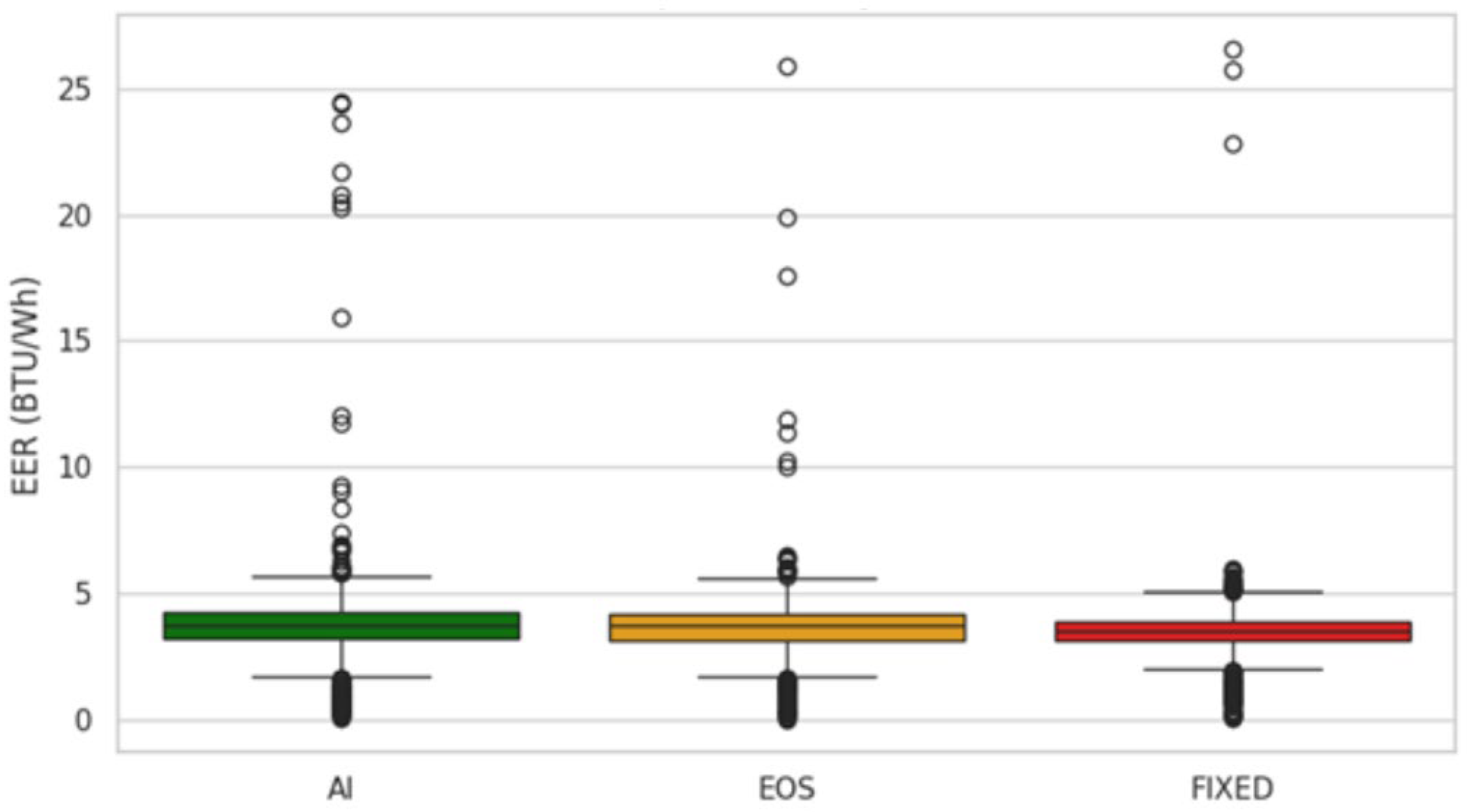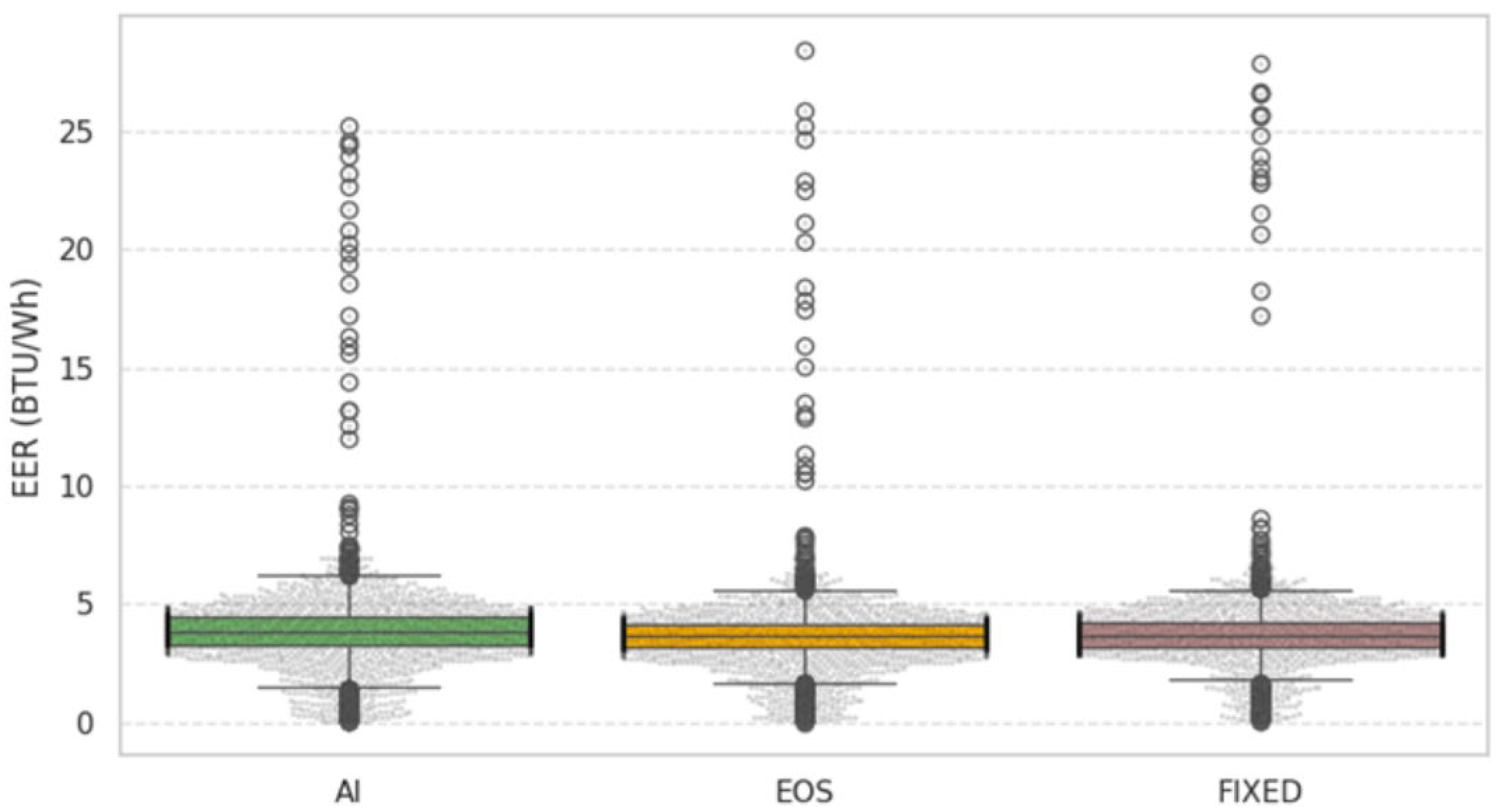Finally, a comprehensive performance evaluation is conducted across the three HVAC control modes using a balanced dataset comprising 1922 samples per mode. This ensures an equitable basis for comparison in terms of energy efficiency and energy consumption. Descriptive statistics reveal that the AI Mode achieves the highest mean EER at 3.93 BTU/Wh (≈3.93 COP), followed by the Fixed Mode at 3.82 and the EOS Mode at 3.70. All three modes exhibit high variability, with maximum EER values exceeding 25 BTU/Wh. Notably, the AI Mode also showed the highest variability in efficiency outcomes (EER standard deviation = 2.10, greater than in Fixed or EOS Modes). This higher variance is a direct result of the AI system’s flexible operation. Under AI control, the chiller plant operated over a wide range of loading conditions—achieving very high EER values when conditions allowed (e.g., running a chiller near its optimal load) and lower EER values during other times (e.g., light-load or rapid cycling periods when the AI was trimming energy use). In contrast, the Fixed Mode’s static setpoints led to a much narrower range of operating conditions and thus a lower EER variance. In essence, the AI Mode’s continuous adjustments caused the HVAC system to experience both extremely efficient and less efficient moments, which is reflected in the broader spread of its EER distribution.