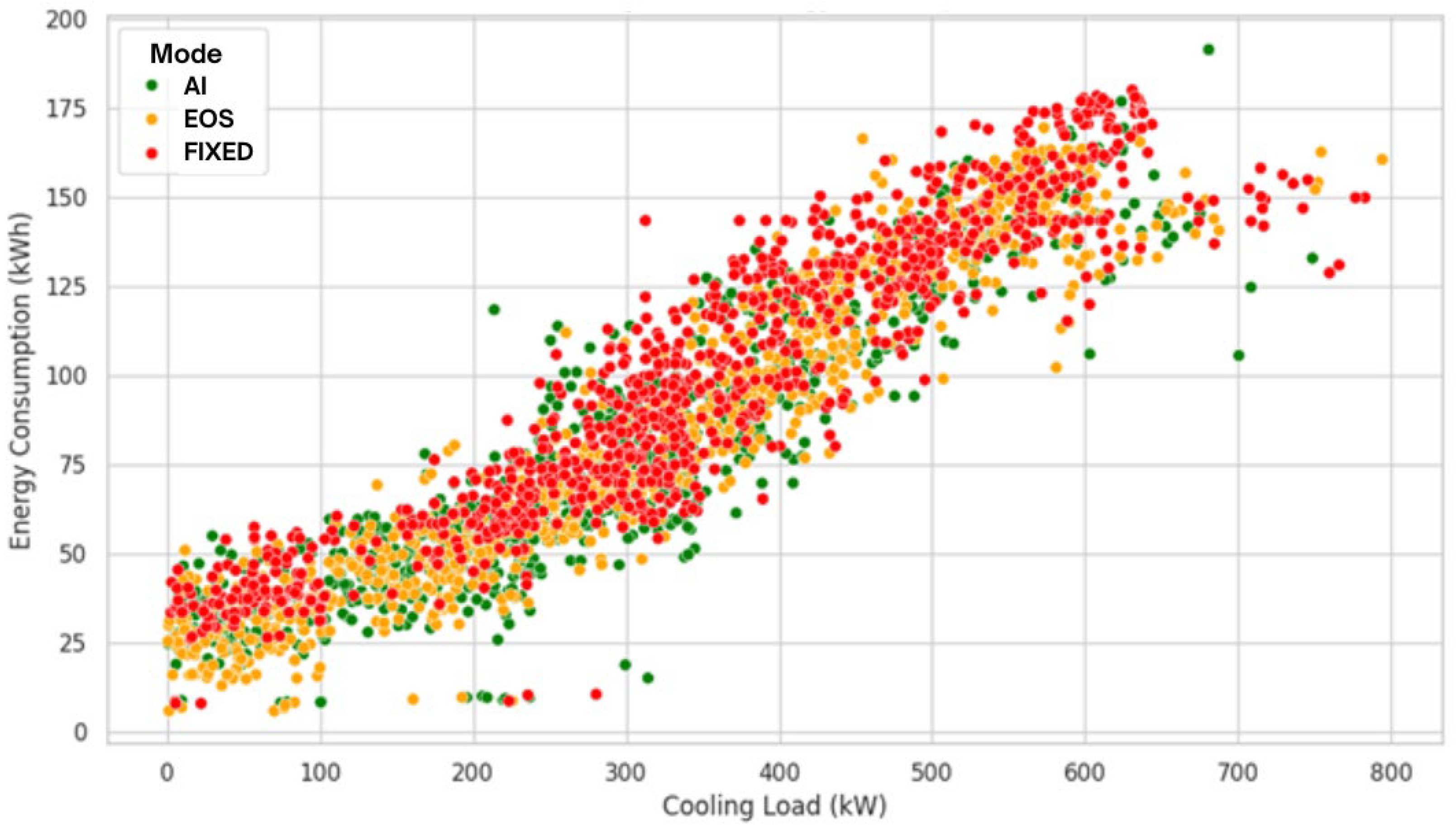 Figure 11 plots cooling load against energy consumption. While all modes show the expected positive trend, the AI Mode consistently tracks below the EOS and Fixed Modes, particularly at higher load levels. This suggests that the AI Mode more effectively manages energy use during periods of high demand, maintaining efficiency without excessive energy consumption.
