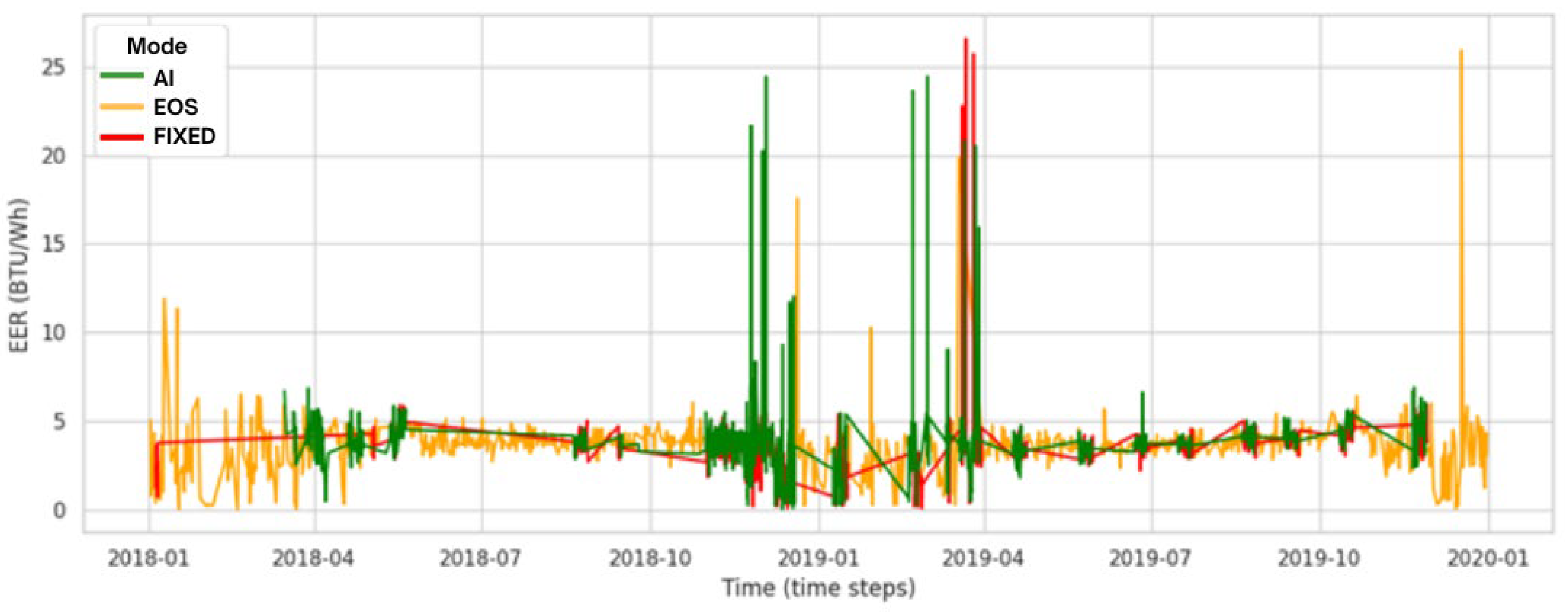 Figure 12 presents a time series of EER across the study period. The AI Mode maintains a higher and more stable EER baseline over time, while the Fixed and EOS Modes exhibit more frequent dips and prolonged periods of lower efficiency. These temporal patterns suggest that the AI Mode is better equipped to adapt to changing environmental and operational conditions. This conclusion is further supported by