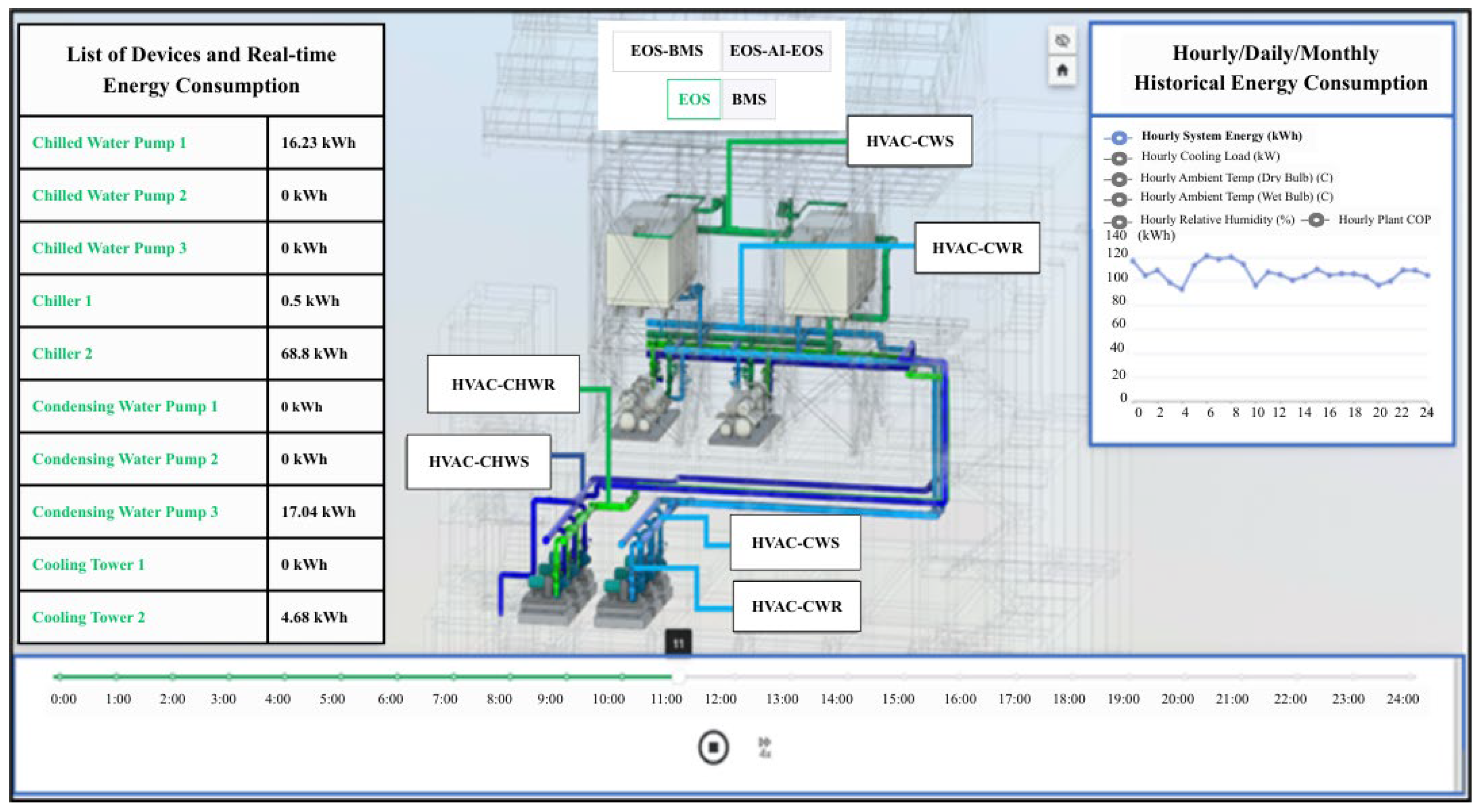 Forecasted values were fed into a rule-based logic layer, which adjusted chiller staging, supply water temperature setpoints, condenser water temperatures, and pump sequencing based on predicted demand. The EOS Mode was implemented in the HVAC digital twin by integrating the LSTM-based forecast engine with a dynamic rule set that simulates real-time control decisions driven by short-term predictions. While this study reports the EOS Mode used in the case study hotel, it is recognised that other ML approaches, such as broad learning system, may be implemented elsewhere [