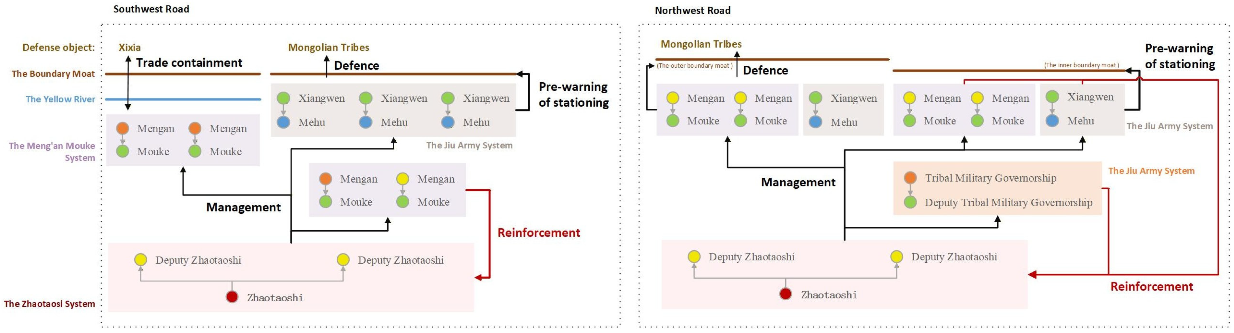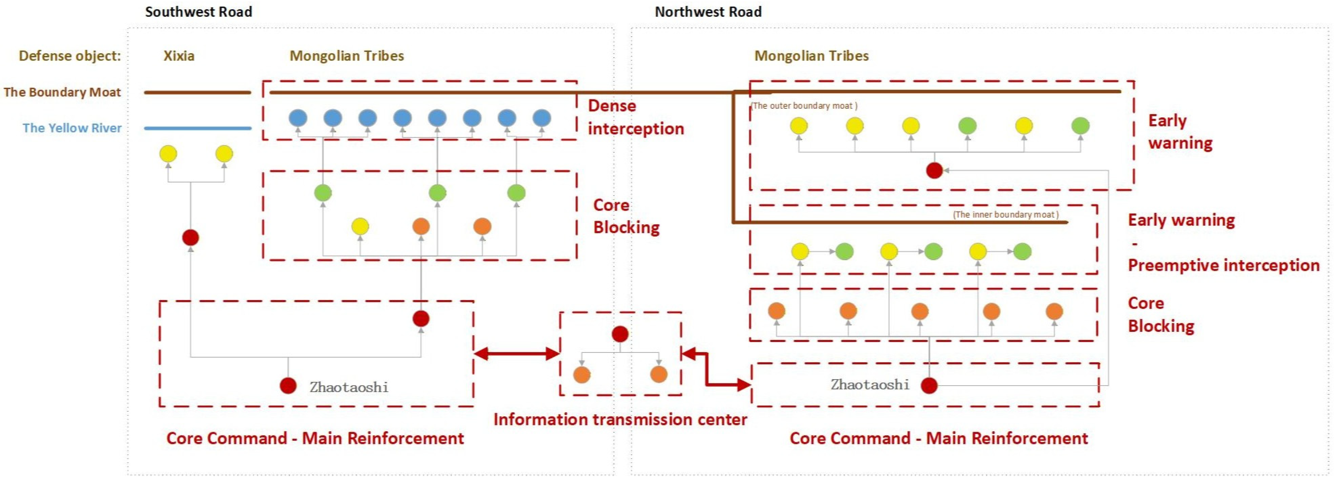 - Based on pre-existing tribal settlements, the Jin Dynasty progressively built the Jin Great Wall defense system, which was made up of settlements and border ditches, in response to external influences. However, the Northwest Route adopted a fighting strategy of “luring the enemy deep into territory for decisive resistance” and established a dual early warning system along both sides of the boundary ditches due to the geographical disparities between the Northwest and Southwest Routes. When battling Western Xia, the Southwest Route avoided high-density settlements and used a commerce containment strategy; when facing the Mongols, it used small-scale settlements to create high-density intercept lines, creating a defense tactic known as “interception-delay-engagement.”