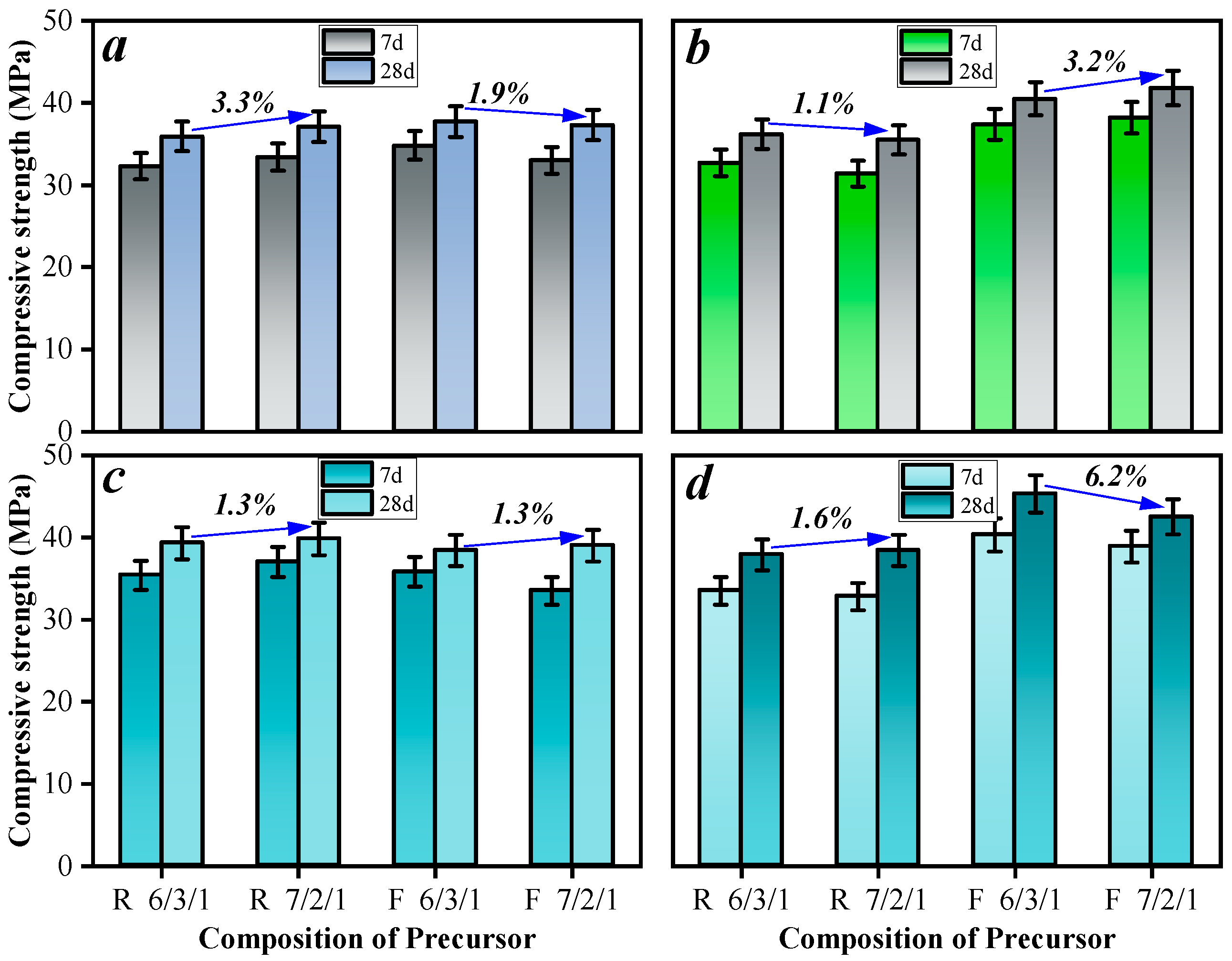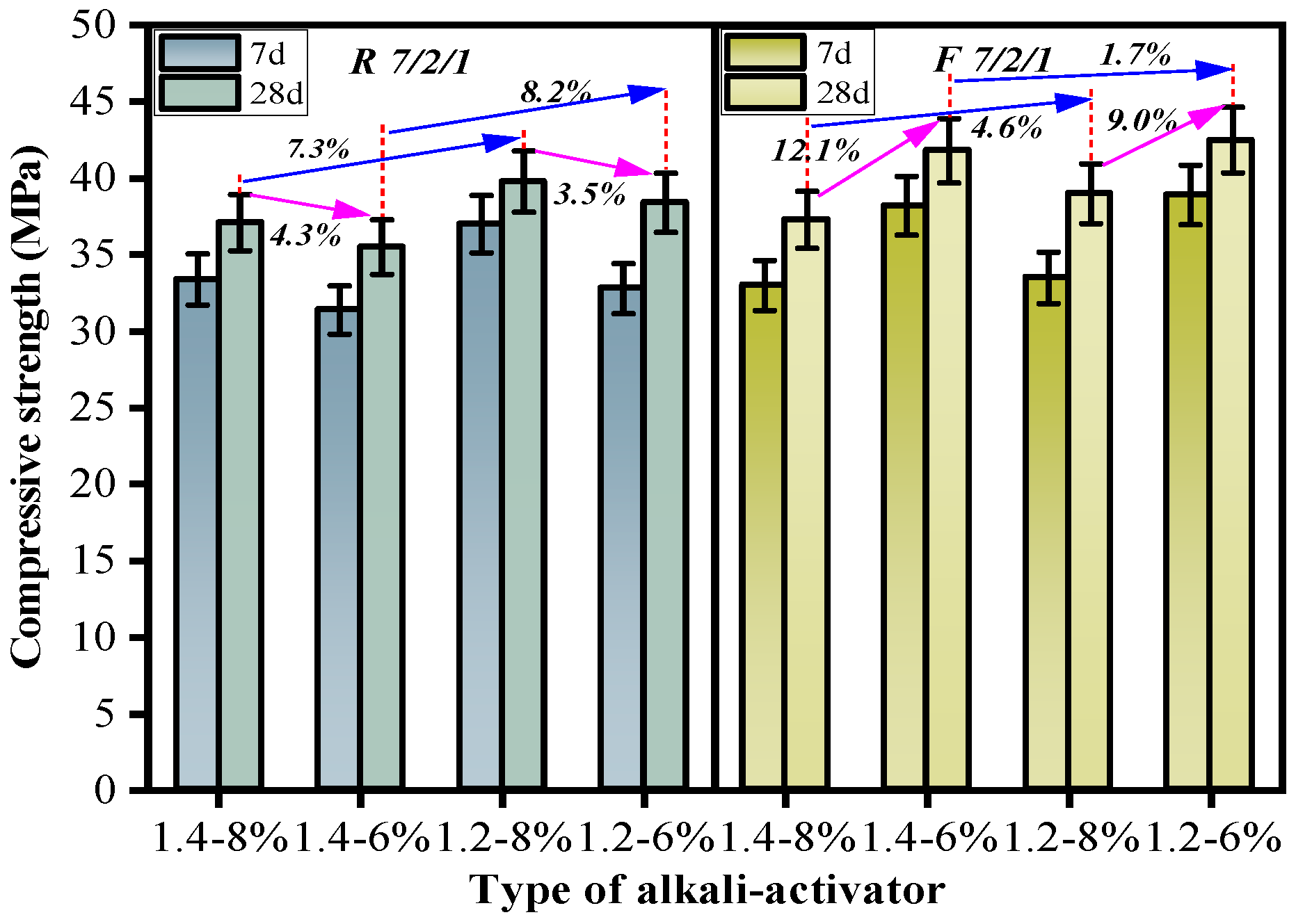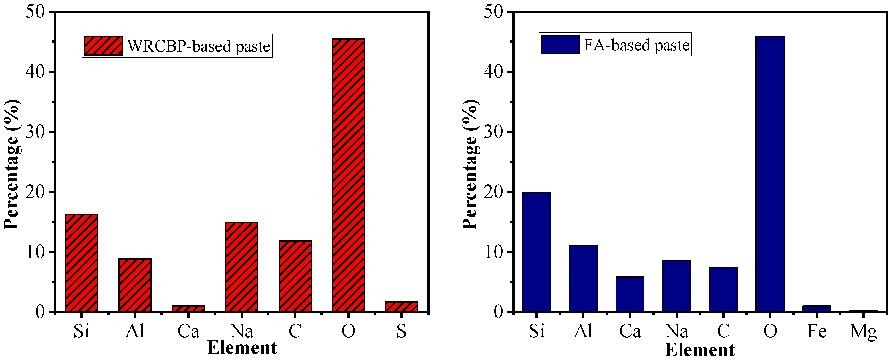 - WRCBP-based pastes cured at 65 °C for 7 days using a 1.2 modulus Na2SiO3 solution with 8% Na2O content achieved a compressive strength of 37.0 MPa, which increased to 39.8 MPa after 28 days. Under appropriate alkali-activated and curing conditions, WRCBP-based pastes attained 93.6% of the compressive strength of FA-based pastes.