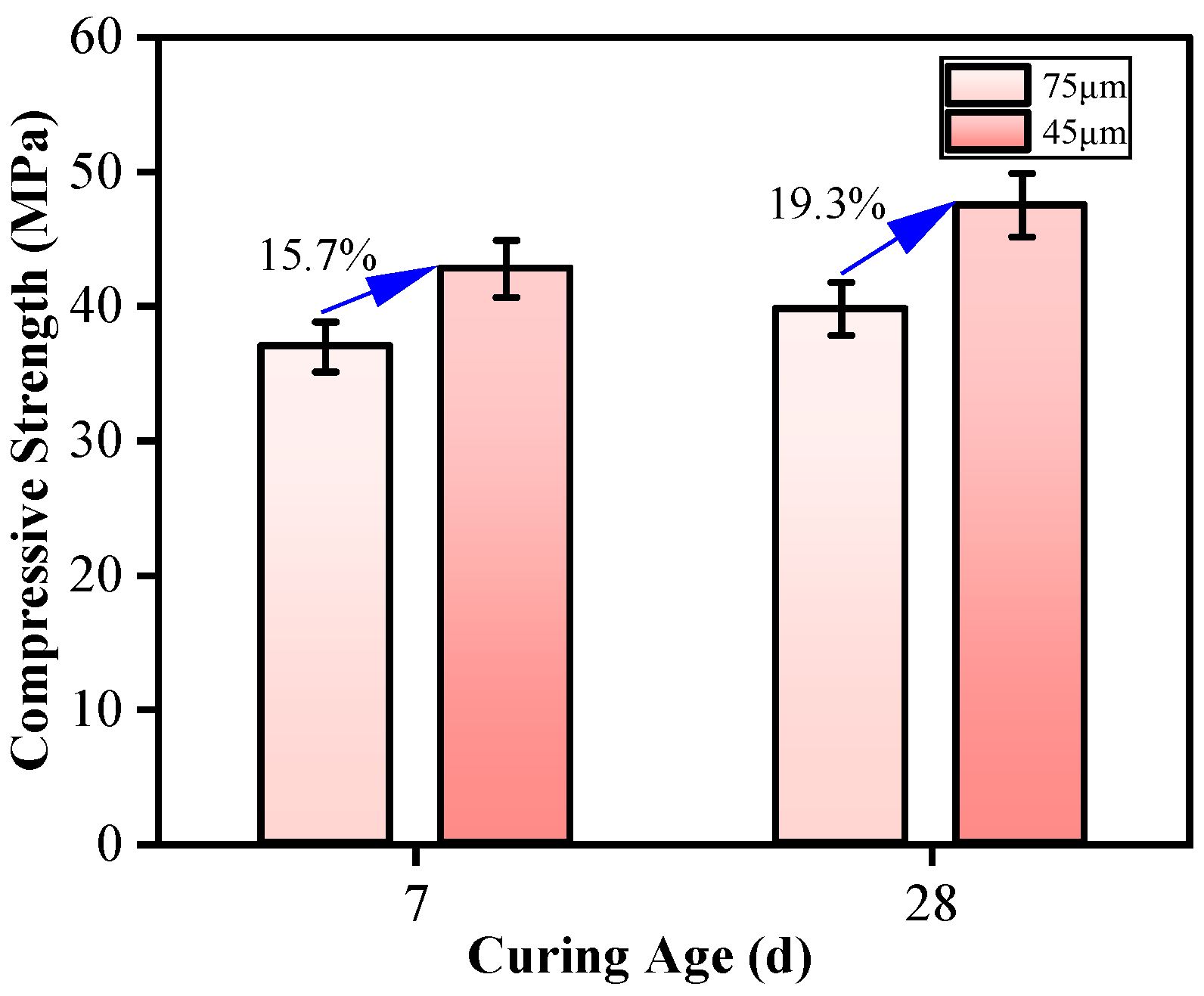 - Particle size significantly influences alkali activation. WRCBP-based pastes with particles <45 μm consistently demonstrated higher compressive strength than those with particles <75 μm, due to the larger specific surface area enhancing dissolution and gel formation during geopolymerization.