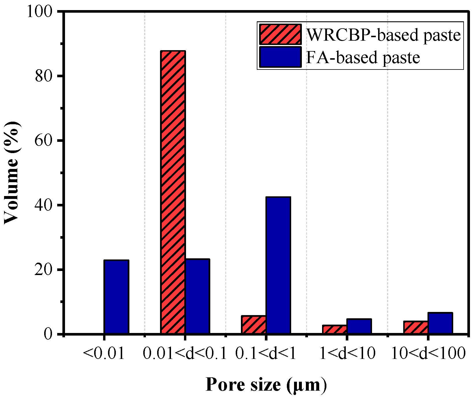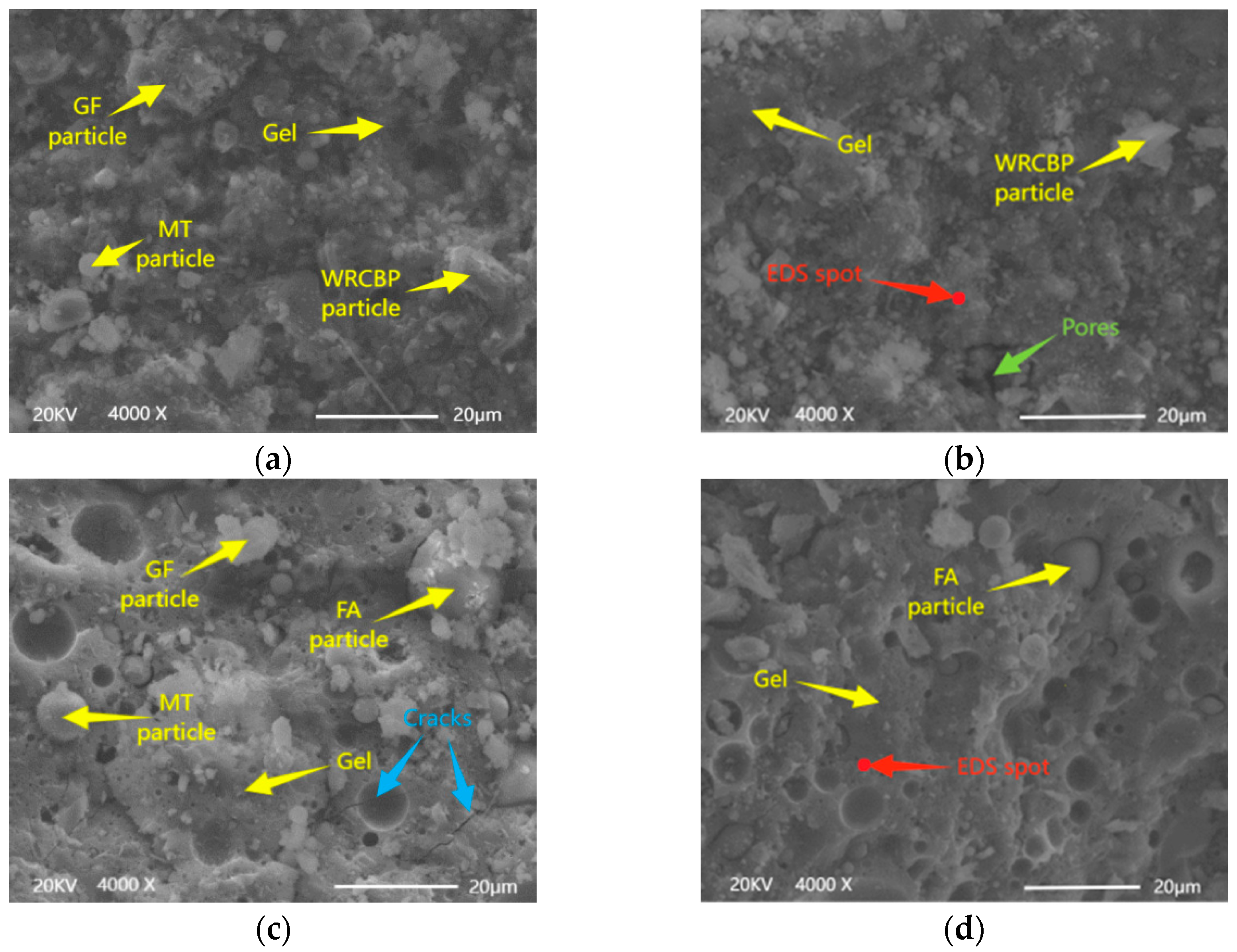 - MIP analysis showed that FA-based pastes had lower porosity and smaller average pore size than WRCBP-based pastes. SEM analysis confirmed the presence of unreacted particles in both matrices but revealed a more homogeneous microstructure in the FA-based pastes.