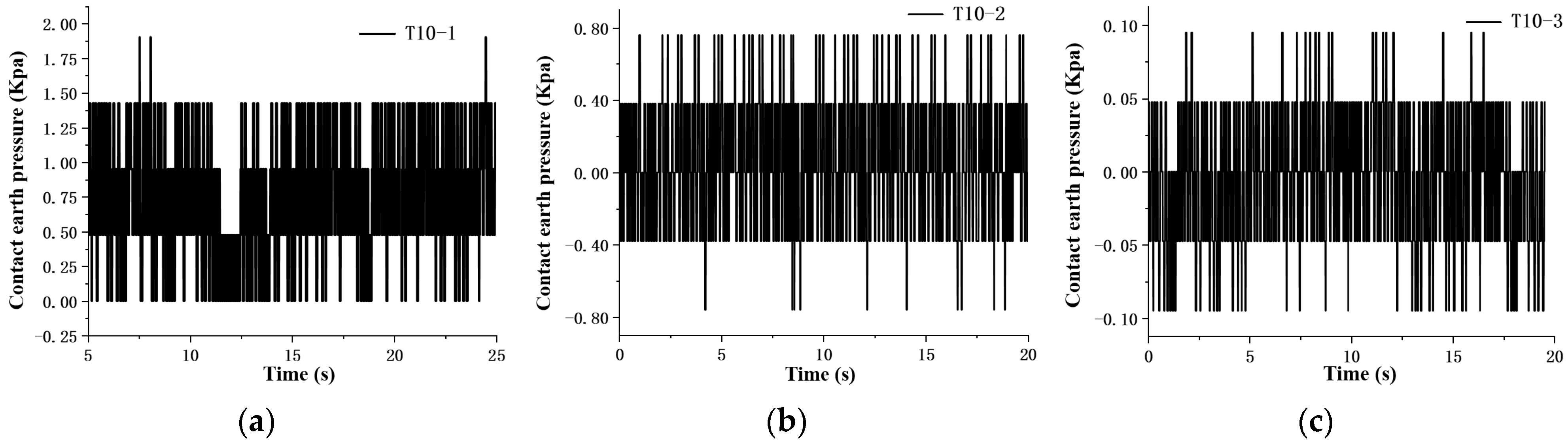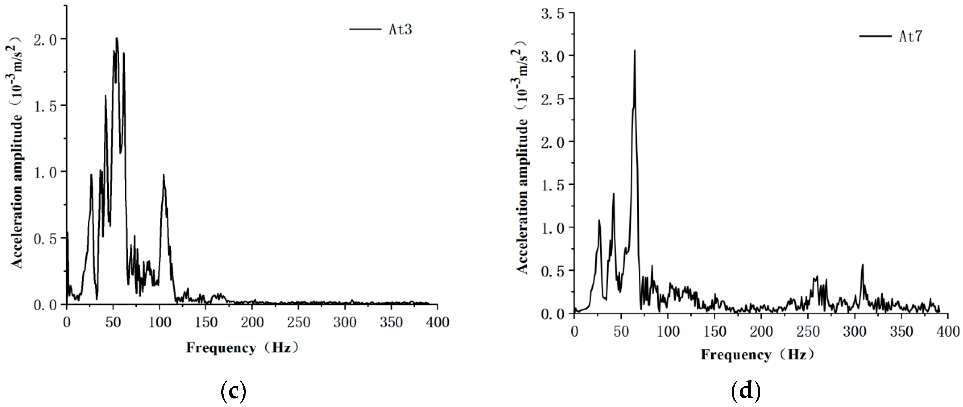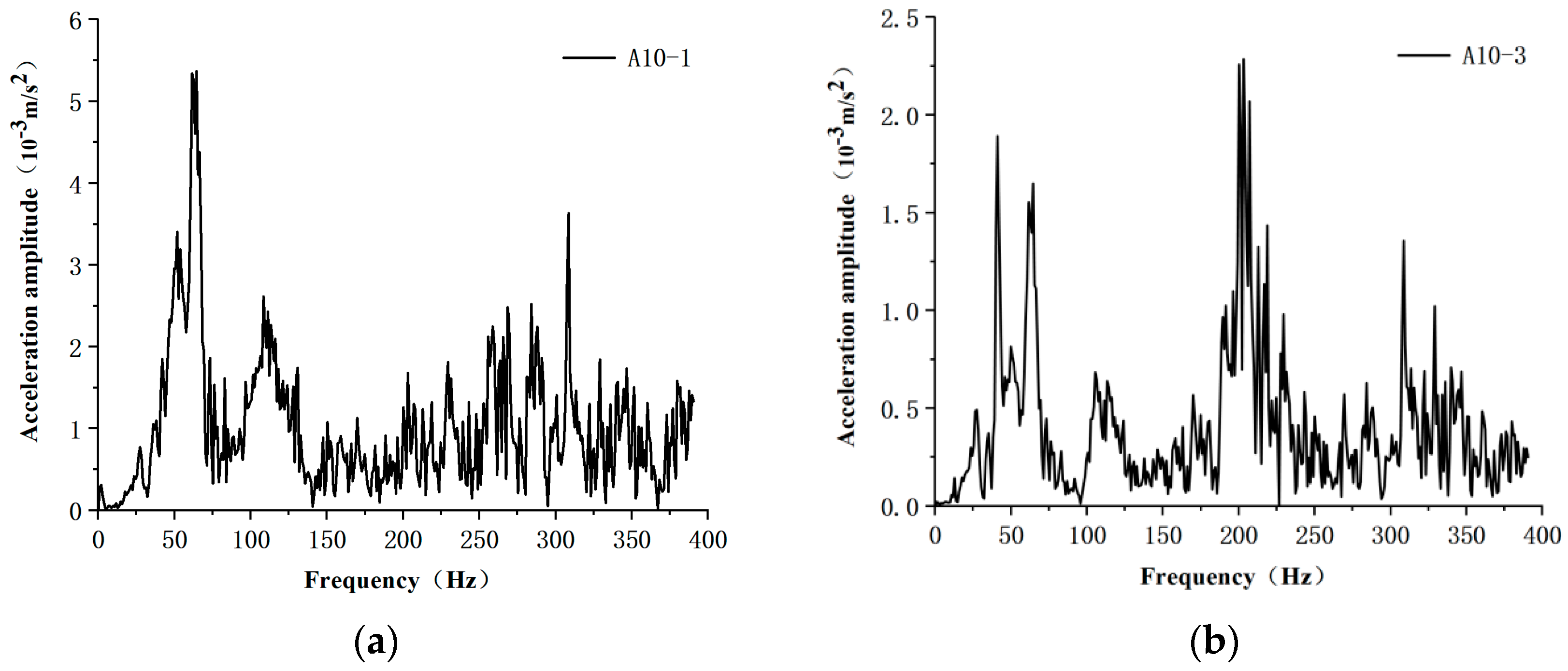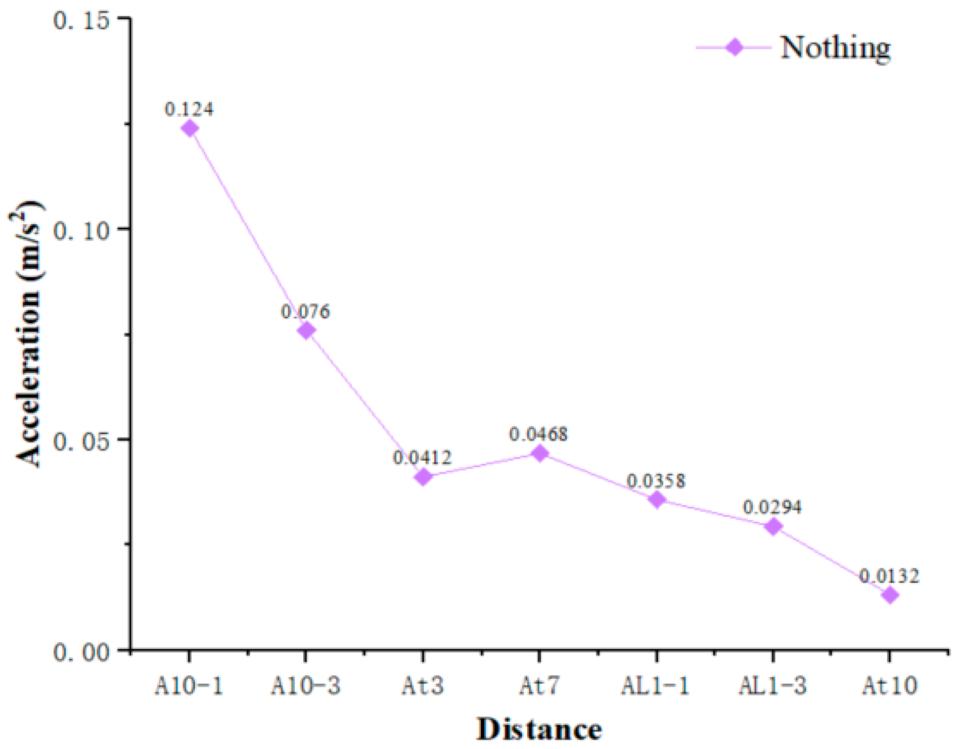 - Vibration Acceleration Attenuation Pattern: The vibration acceleration generally decreases with increasing distance from the source. The soil exhibits a stronger suppressive effect on high-frequency vibrations, which attenuate more rapidly, while mid-to-low frequency vibrations attenuate relatively more slowly. The acceleration is highest in the soil beneath the tunnel lining, followed by the side sections, and is relatively lower in the upper part.