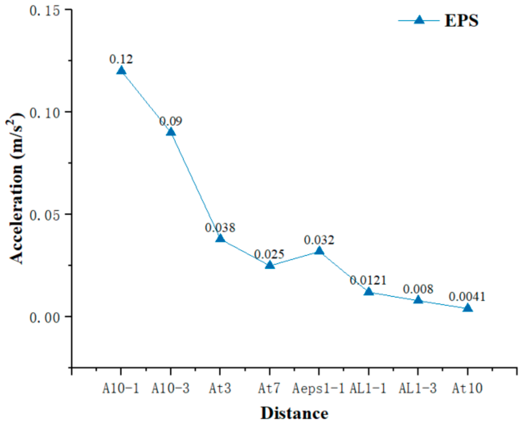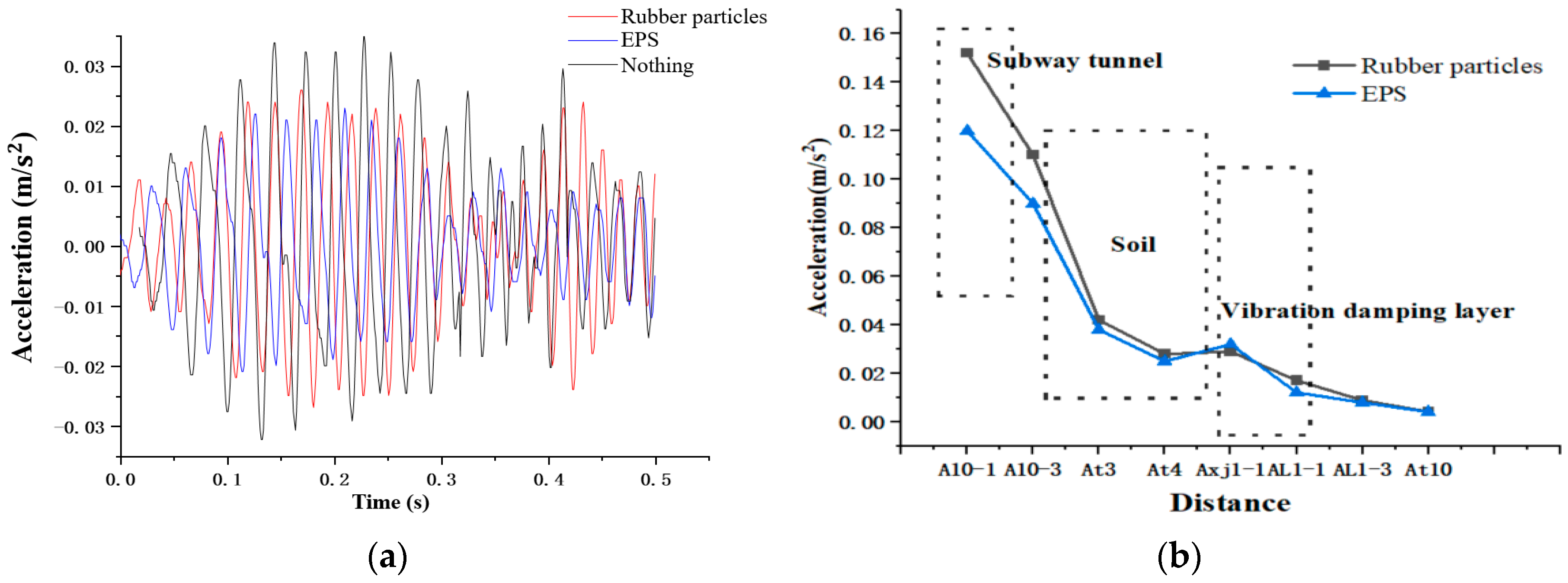 - Vibration Mitigation Effectiveness of EPS and Rubber Particles: The model tests show that the attenuation ratios of vibration acceleration for EPS and rubber particles are 60% and 41%, respectively. Both materials can reduce the peak acceleration. A steeper attenuation slope is observed at the isolation layer location, and EPS demonstrates superior vibration attenuation compared to rubber particles, indicating better overall performance.