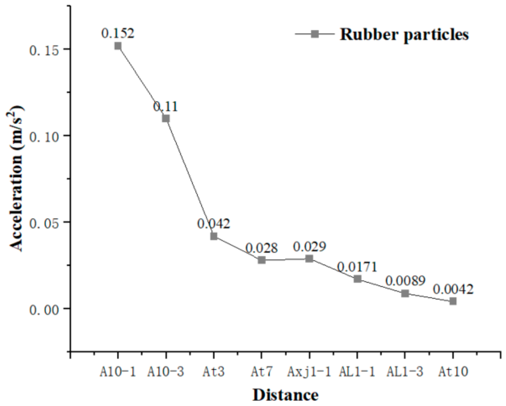 - Based on comparative observations of material changes before and after testing, and in light of the material properties and existing research [20], the vibration isolation mechanisms of the two materials are inferred as follows: EPS dissipates vibration energy through compression-induced gas release and foam deformation, accompanied by inter-particle sliding friction, while rubber particles achieve energy dissipation via minor elastic deformation, inter-particle sliding friction, and gap filling effects.
