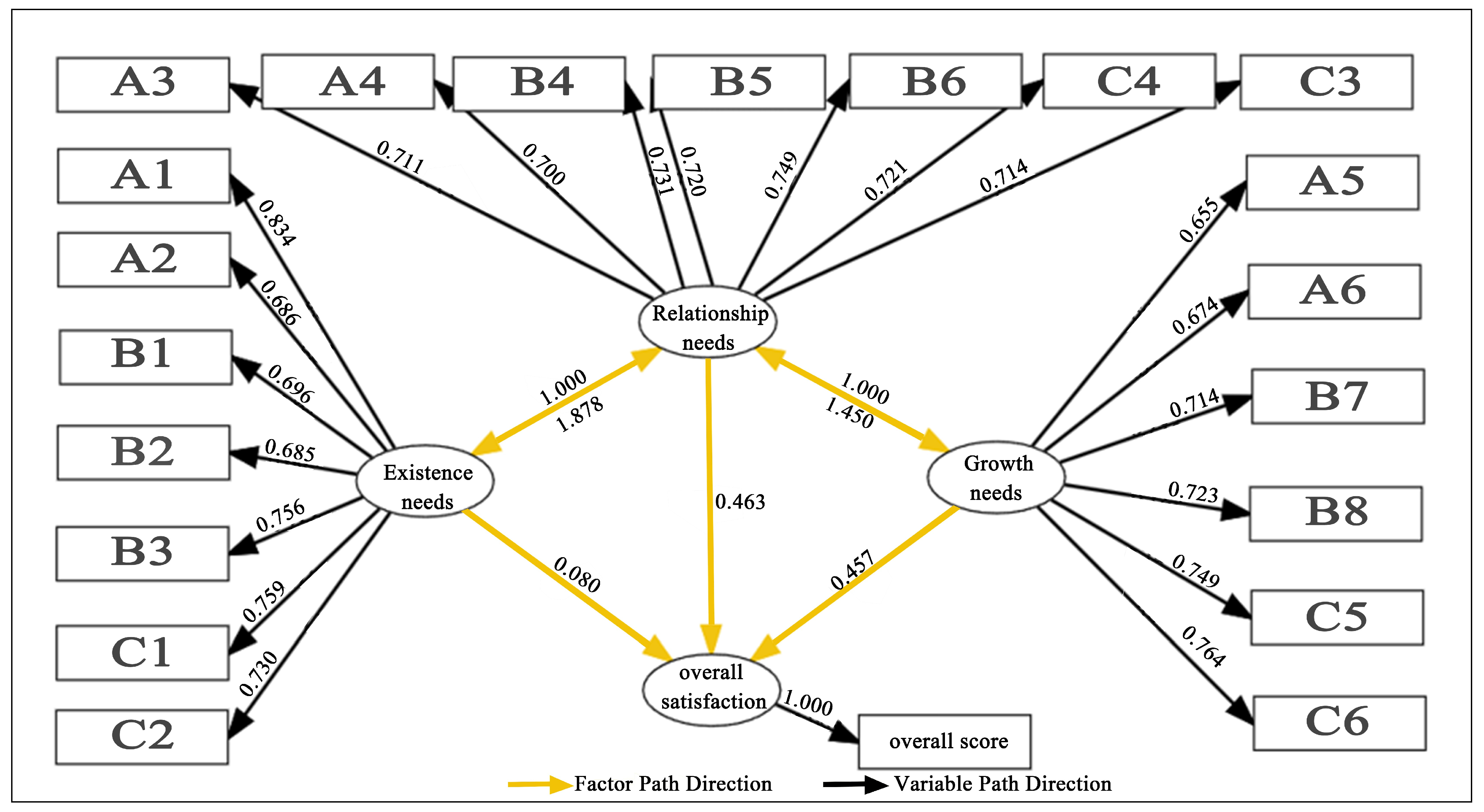 | Existence needs | → | overall satisfaction | 1.144 | 0.08 | 0.261 | 4.389 | 0.000 *** |