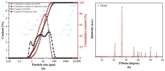 Expansive soils were collected from the excavation site of the Guangxi Hengyang–Nanning Highway. The soil exhibited a specific surface area of 10.25 m2/g, measured using the Brunauer–Emmett–Teller (BET) method. Figure 1 shows the photograph and microscopic morphology of the expansive soils. In addition, the expansive soil has a liquid limit of 33.6%, a plasticity index of 16%, a specific gravity of 2.7, and a free swell potential of 42.3%. Ground granulated blast furnace slag (GGBFS), with an apparent density of 2800 kg/m3, was provided by Blast Furnace (Fuyang Xinyuan Building Materials Co., Ltd., Fuyang, China). The chemical compositions of the expansive soils and GGBFS were determined by X-ray fluorescence (XRF) analysis, and the results are listed in Table 1. Figure 2 presents the particle size distribution of GGBFS and expansive soils, along with the X-ray diffraction (XRD) patterns of the expansive soils. A CP-1200 water-reducing agent was supplied by Water-Reducing Agent Production Equipment (Nanjing Xinyi Synthetic Technology Co., Ltd., Nanjing, China). Quartz powder (80 mesh) was used as filler. Sodium hydroxide and sodium silicate nonahydrate were purchased from Sodium Hydroxide and Sodium Silicate Nonahydrate Preparation Equipment (Sinopharm Chemical Reagent Co., Ltd., Beijing, China.