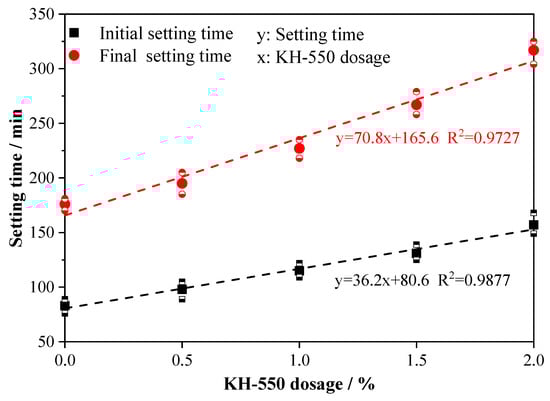 Figure 3 presents the setting times of AABS samples containing different dosages of KH-550. As shown, the addition of KH-550 significantly retarded the setting process. Both the initial and final setting times increased almost linearly with the dosage of KH-550. Compared with the control sample (ASK0), the addition of 0.5–2.0% wt.% KH-550 significantly extended the initial and final setting times by 18.1–89.2% and 10.8–80.1%, respectively. This retardation effect is attributed to the adsorption of hydrolyzed KH-550 silane molecules onto the surfaces of slag and soil particles, which hinders early ion dissolution and delays the setting process [21]. The prolonged setting time provided by KH-550 also enhances workability and promotes a more uniform distribution of binders within the stabilized expansive soils. In summary, KH-550 significantly retards both the initial and final setting of AABS in a dosage-dependent manner. This extended workable time is beneficial for practical mixing and placement operations.