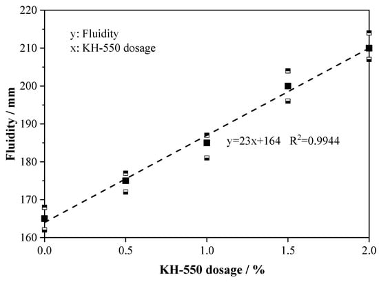 Figure 4 illustrates the fluidity of fresh AABS samples with varying KH-550 dosages. The results show that adding 0.5–2.0 wt.% KH-550 significantly improved fluidity, with increases of 6.1–27.2% compared to ASK0. Fluidity exhibited an approximately linear relationship with KH-550 content, suggesting a predictable influence of dosage on paste workability. This enhancement is attributed to the organic silane structure of KH-550, whose hydrophobic groups reduce interparticle friction and facilitate more uniform dispersion of slag and expansive soil particles [22]. Furthermore, the partial retardation of early hydration limits the formation of flocculated products in the fresh paste, further promoting flowability. These combined effects are particularly advantageous for stabilizing expansive soils, ensuring even binder distribution and enhanced workability within the solidified matrix.