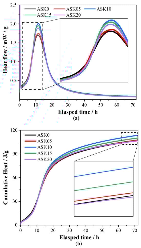 Figure 5a presents the heat flow of AABS samples. Two distinct exothermic peaks can be observed. Isothermal calorimetry was employed to investigate the impact of KH-550 on the temporal evolution of the hydration reactions in AABS. The first peak occurs within minutes after mixing, corresponding to the wetting and initial dissolution of slag particles, while the second, more pronounced peak is associated with the rapid formation of hydration products [30,31,32]. Addition of KH-550 shifted the heat flow curves to the right, particularly during the induction period, indicating effective retardation of early hydration and setting, consistent with the observed setting-time results. Interestingly, the intensity of the main exothermic peak was influenced by KH-550 dosage; for instance, 2.0 wt.% KH-550 reduced the peak height by 18% compared with ASK0, suggesting a more prolonged and sustained hydration process. This effect is attributed to the hydrolysis of KH-550 into silanol groups, which condense to form Si–O–Si linkages or silane oligomers that serve as additional nucleation sites, facilitating the polymerization of and C–A–S–H gels. Moreover, interactions between hydrolyzed KH-550 and soil minerals such as montmorillonite may enhance particle dispersion and generate more reactive interfaces, further promoting gel formation at later stages. Overall, KH-550 delays early hydration while supporting the continuous development of hydration products in AABS and improving interaction with expansive soil components.