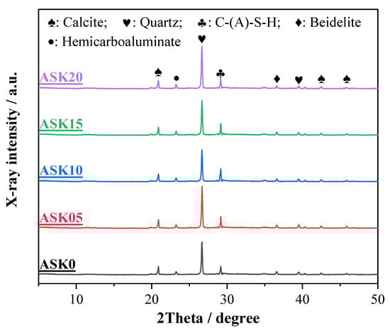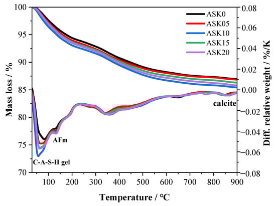 Figure 7 presents the TG-DTG analysis of 7 d AABS samples. Three major endothermic peaks appear in the DTG curves, corresponding to the dehydration of C–A–S–H gels (50–130 °C), the decomposition of AFm phases (150–200 °C), and the decomposition of calcite (810–860 °C) [36,37]. The AFm-related peak can be attributed to the presence of hemicarboaluminate, as confirmed by the XRD patterns of 7 d AABS samples. Among all samples, ASK10 exhibited the highest mass loss in the C–(A)–S–H region, indicating the formation of more C–(A)–S–H gels. The AFm peak also increased with KH-550 addition, suggesting enhanced formation of AFm phases. Compared with ASK0, the mass loss of AABS samples increased with KH-550 dosage up to 1.0 wt.%, reflecting the promoting effect of KH-550 on hydration. This enhancement can be attributed to the hydrolysis of KH-550, which generates silanol groups that facilitate nucleation and growth of C–(A)–S–H gels and AFm phases. However, further increasing the KH-550 content beyond 1.0 wt.% did not significantly increase the mass loss, implying that excessive KH-550 is less effective in stimulating additional hydration product formation. The TGA curves also show that ASK10 exhibited the highest mass loss, indicating that 1.0 wt.% KH-550 is the optimal dosage.