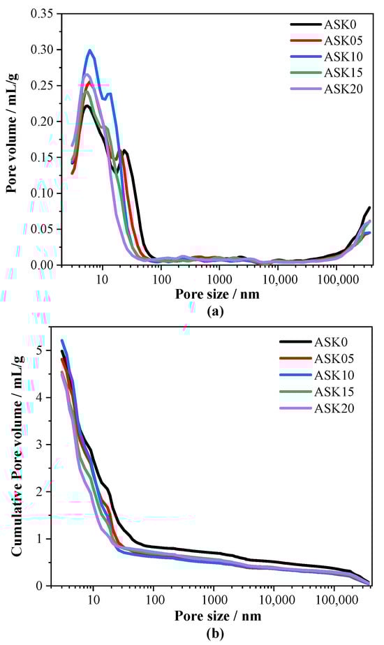 Pore size distribution curves of 7 d AABS: (a) pore size distribution, (b) cumulative pore volume.