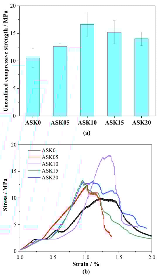 Figure 11a shows the 7 d unconfined compressive strength (UCS) of AABS samples. The addition of KH-550 significantly influenced the UCS, which correlates directly with the observed pore structure changes from MIP analysis. Specifically, 0.5–1.0 wt.% KH-550 increased UCS by 20.2–58.1% compared with the control. This improvement is consistent with the pore structure refinement: the proportion of gel pores (<10 nm) increased by up to 35.7% for ASK10, while the capillary pores (10–100 nm) were substantially reduced, with the second peak around 23 nm shifting toward smaller sizes and nearly disappearing at 2.0 wt.% KH-550. The cumulative pore volume above 10 nm also decreased notably, indicating a reduction in total porosity and harmful pores. These changes enhance the matrix densification, reduce weak points, and promote stronger interparticle bonding, collectively contributing to the observed increase in UCS. At 2.0 wt.% KH-550, a slight decrease in UCS was observed. This may be attributed not only to excessive organic molecules hindering early hydration and C–(A)–S–H gel formation, but also to other mechanisms associated with high KH-550 dosage. These include self-condensation of silanol groups, which can reduce the availability of reactive sites for bonding with slag and soil particles; reduced ion mobility in the pore solution, which may slow down hydration reactions; and surface saturation of particles, limiting further interaction between KH-550 and the matrix. Despite these effects, the quantified pore refinement and porosity reduction still largely explain the overall UCS trends with KH-550 addition, highlighting that moderate dosages (0.5–1.0 wt.%) are most effective for enhancing mechanical performance.