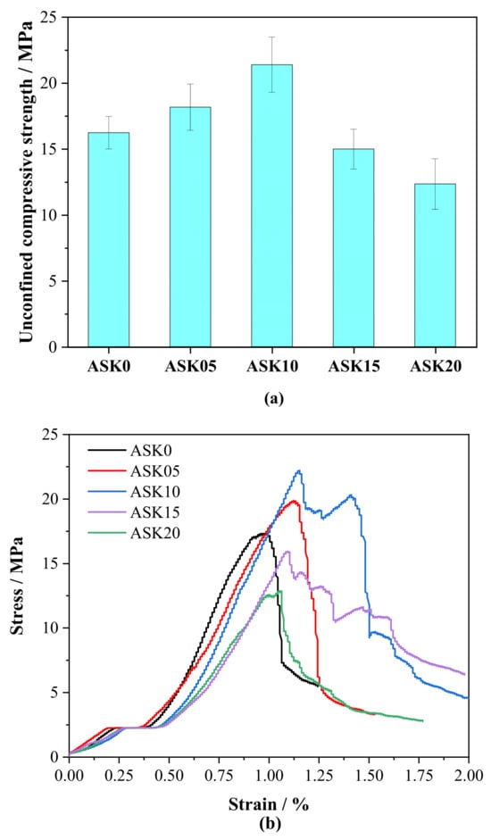 Unconfined compressive strength of 7 d AABS samples: (a) strength, (b) stress–strain curves.