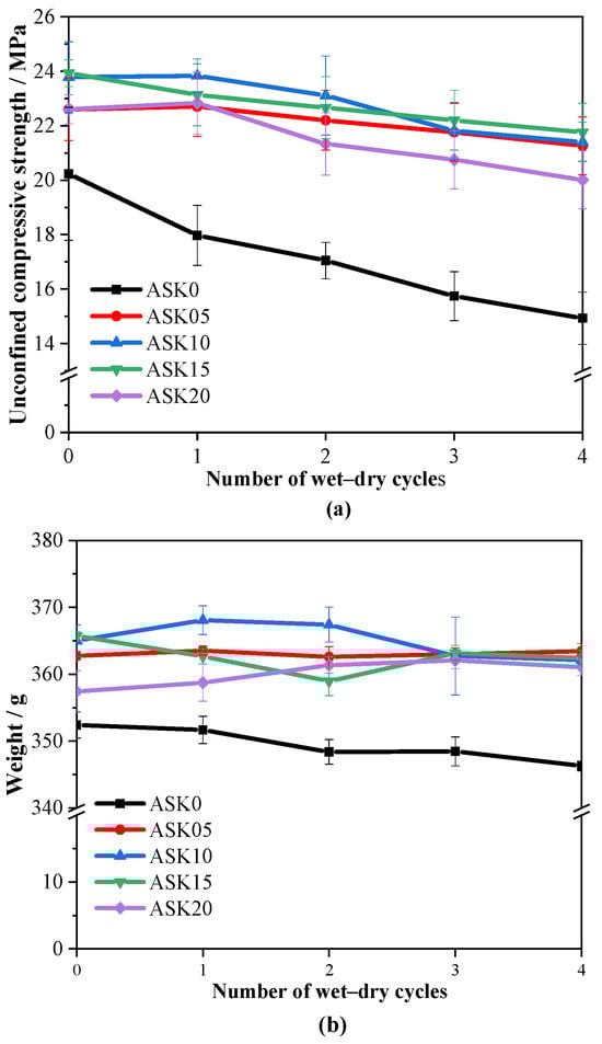 Figure 13a presents the UCS of 28 d AABS samples after four wet–dry cycles. The control sample without KH-550 exhibited a decrease in UCS from 20.23 MPa to 14.93 MPa after the cycles, showing an approximately linear reduction, indicating that unmodified AABS is prone to strength loss under wet–dry cycling. In contrast, KH-550-modified AABS samples demonstrated a UCS increase of 11.7–18.3% compared with ASK0. This improvement is consistent with the refined pore structure observed in MIP analysis, where an increased proportion of gel pores (<10 nm) and reduced capillary pores (10–100 nm) lower the total porosity and reduce weak points, resulting in a denser and more cohesive microstructure. The trend aligns with that observed for the 7 d UCS, suggesting that KH-550 continuously reinforces interparticle bonding and optimizes pore structure throughout curing and cyclic exposure. After four wet-dry cycles, the UCS of KH-550-modified AABS remained largely stable. In contrast, the unmodified sample (ASK0) suffered a significant strength loss of 2.59 MPa. This contrast clearly demonstrates that KH-550 modification enhances the durability of AABS under cyclic environmental stress. These findings indicate that KH-550-modified AABS can effectively stabilize expansive soils, preserving structural integrity and mechanical performance under long-term environmental stress, offering a reliable approach for sustainable soil improvement.